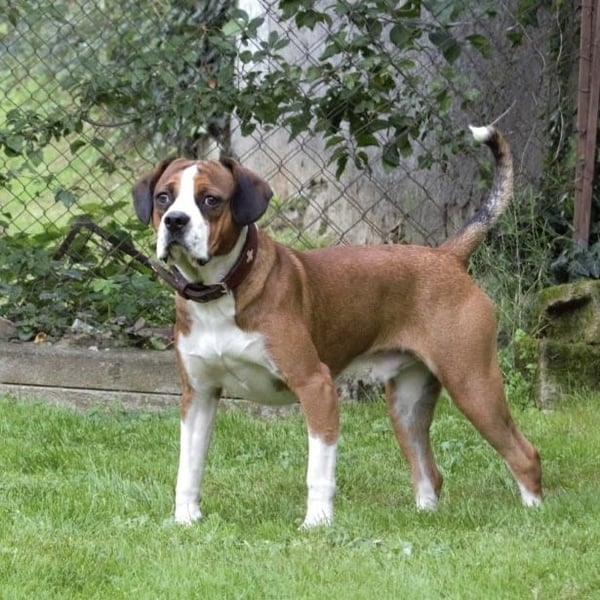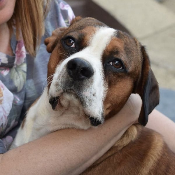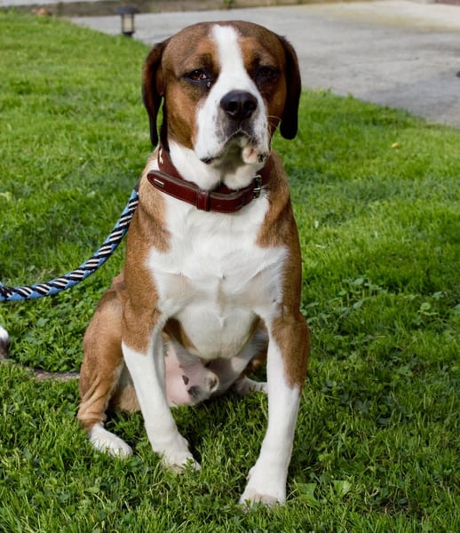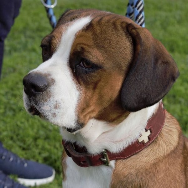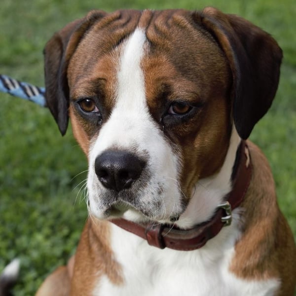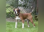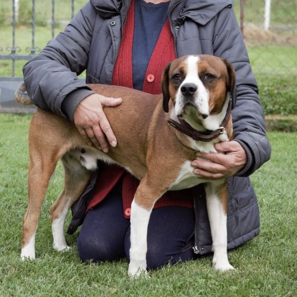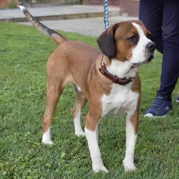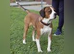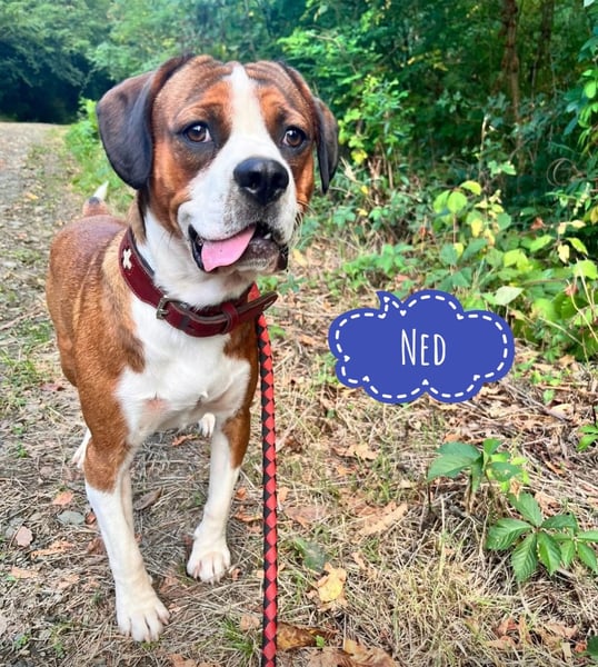 Ned ist ca. 1 Jahr alt (geb. 01.10.2024), 48 cm groß und 19 kg schwer. Vermutet wird ein Boxer Mischling, eventuell mit einem Beagle.