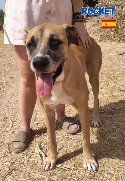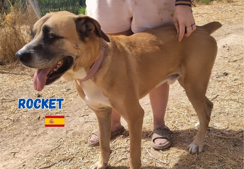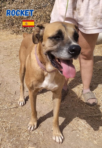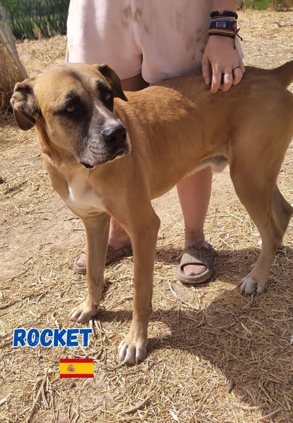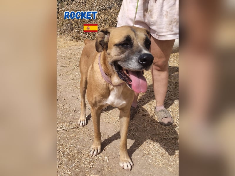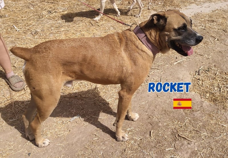 Rocket ist ein Boxer-Mischling unbekannter Herkunft. Wie viele Hunde in Spanien wurde er ausgesetzt, ohne dass man wusste, wer sein Besitzer war. Man fand ihn vor der Tür des Shelters angebunden. Es dauerte nur einen Tag, bis er den Helferinnen vertraute. Rocket ist ein geselliger Hund; er akzeptiert jeden von Anfang an und ist geduldig und freundlich zu allen Menschen. Er ist ein starker, aber ausgeglichener Hund, der sich gut mit allen Hündinnen und einigen Rüden versteht. Daher wäre es wichtig, dass es in seinem neuen Zuhause keine Rüden gibt. Wahrscheinlich würde er sich gut mit ihnen verstehen, aber manchmal ist das nicht der Fall.