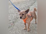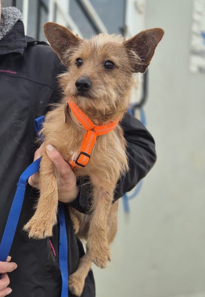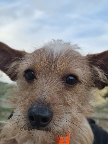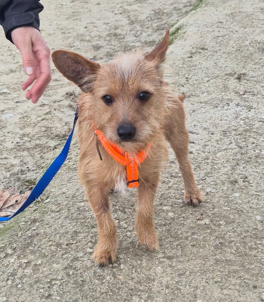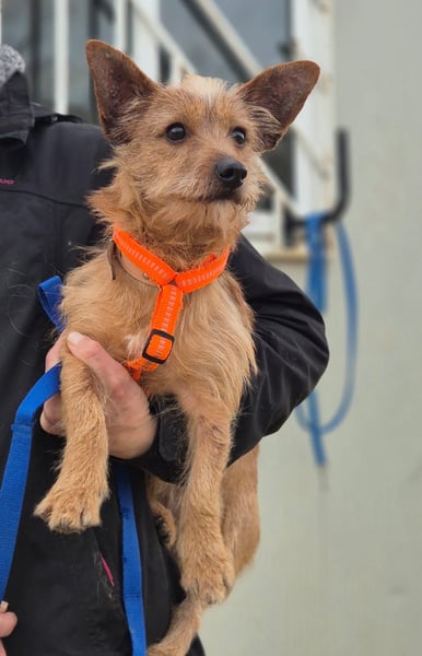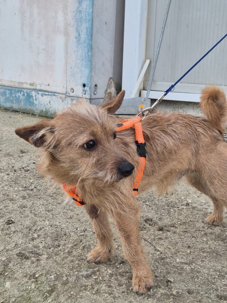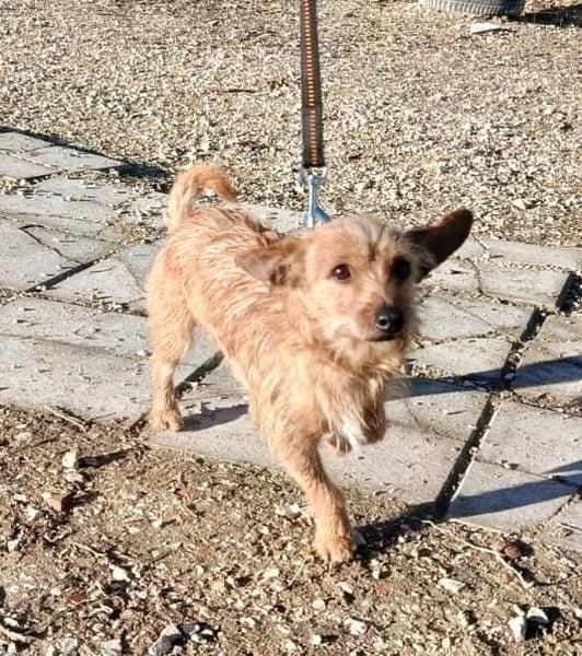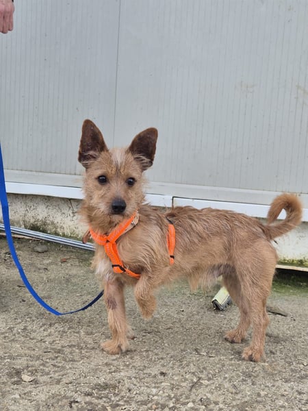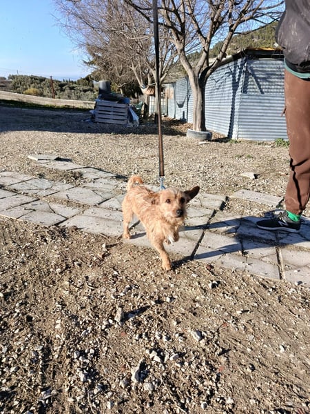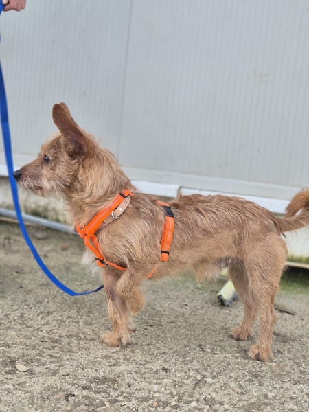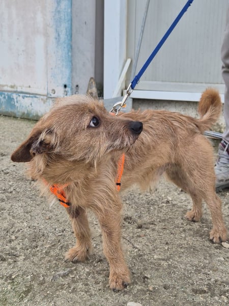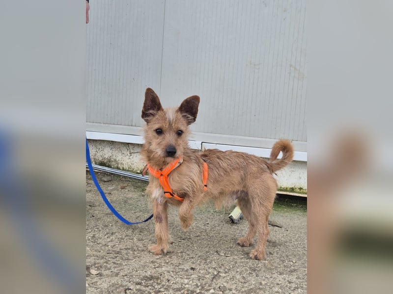 Atón ist ein junger, hellbrauner ev. Cairn-Terrier-Mix. Er ist einer dieser Hunde, bei denen man unweigerlich lächeln muss – freundlich, sanft und einfach zum Verlieben.
