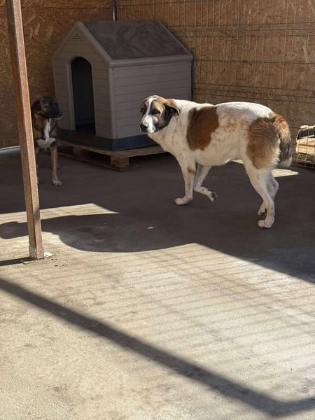 Derzeit lebt er in einem Außengehege und teilt sich seinen Zwinger mit drei anderen Hunden.