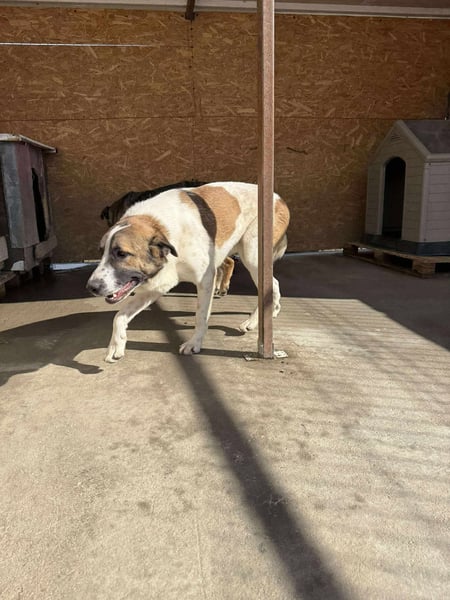 Derzeit lebt er in einem Außengehege und teilt sich seinen Zwinger mit drei anderen Hunden.