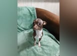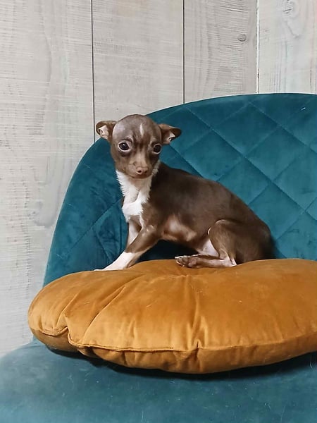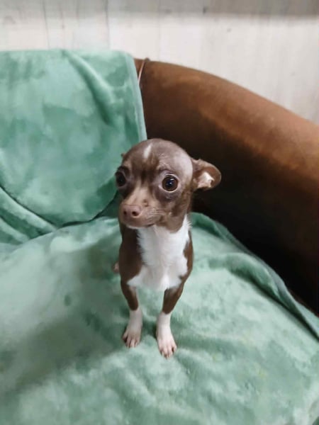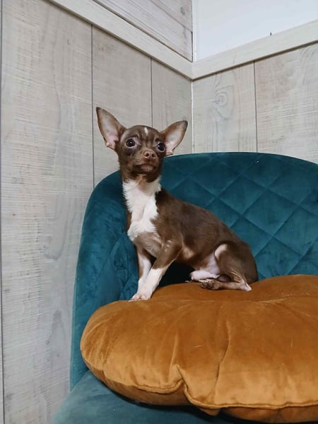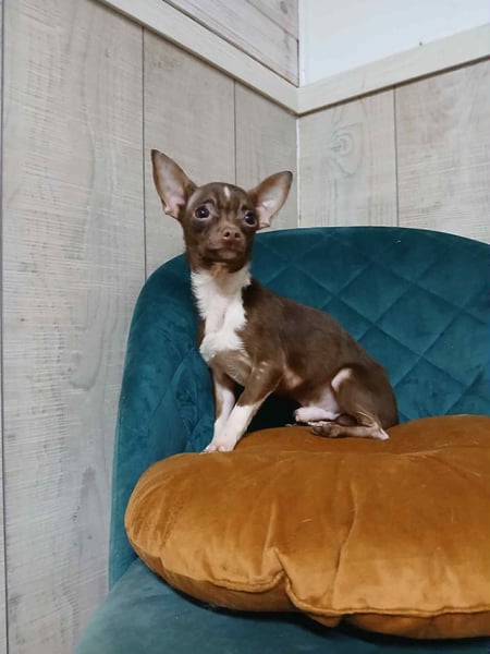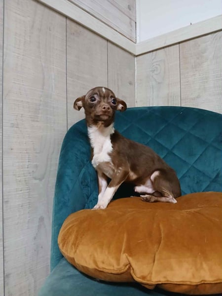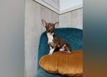Der kleine Alex wurde im August 2024 geboren und ist ein kleiner Chihuahua-Rüde. Er erinnert an ein kleines Wesen aus Porzellan: wunderschön, aber zerbrechlich.
