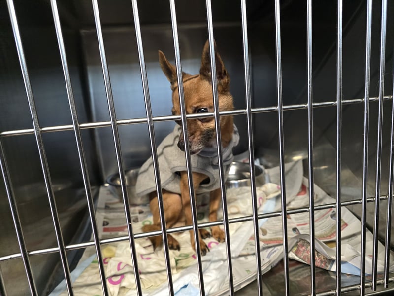 Da es im Moment sehr kalt auf Sardinien ist, hat er ständig ein Mäntelchen an und liegt in einer Decke. 2x am Tag wird er aus dem Käfig geholt, damit er sein Geschäft machen kann.