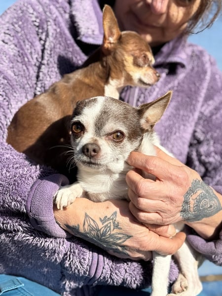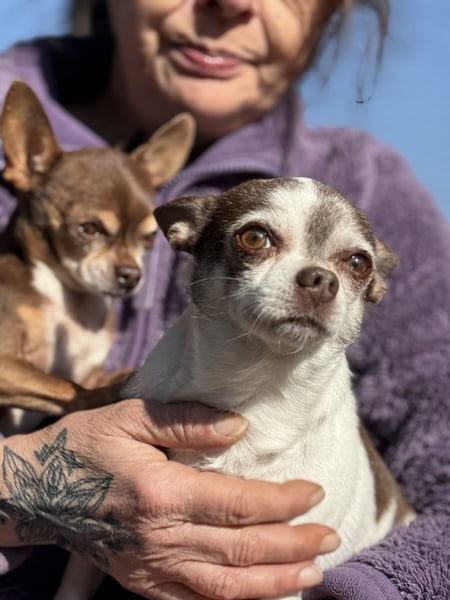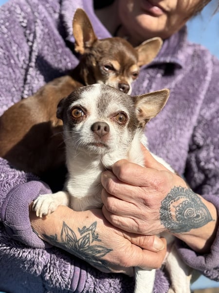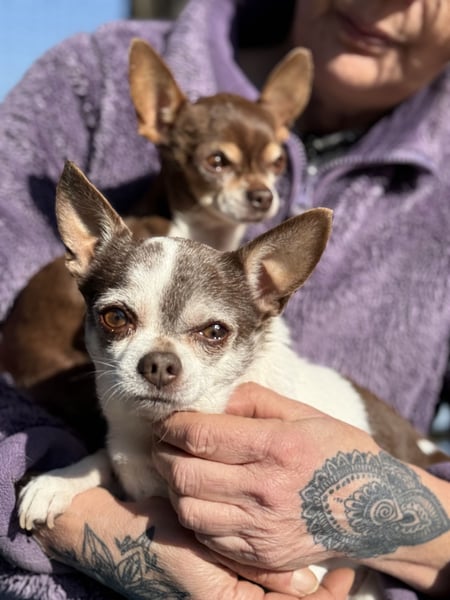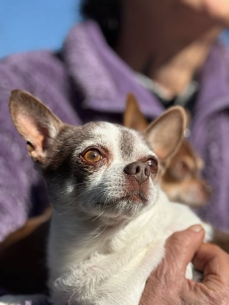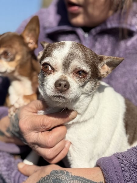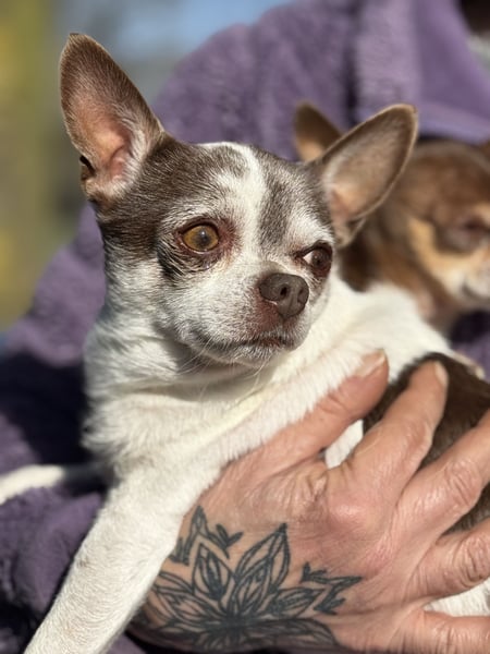 Kiwi ist, als Teacup-Chihuahua, um einiges kleiner und zierlicher und hat leider eine längere Krankengeschichte. Er leidet an Struvitsteinen und musste bereits wegen eines größeren Steins operiert werden. Auch aktuell ist das Thema weiterhin präsent und er wird regelmäßig untersucht. Beim Wasserlassen hat er gelegentlich Schwierigkeiten, weshalb er in Innenräumen eine Rüdenbinde trägt, was er gut kennt und problemlos akzeptiert. Trotz allem zeigt er sich lebensfroh und aufmerksam.