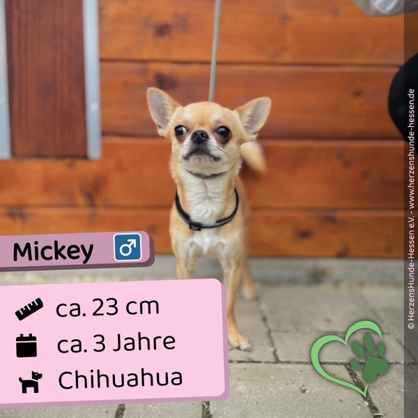 Mickey ist ein etwa 3‑jähriger Chihuahua-Mix-Rüde, der von seinem Besitzer abgegeben wurde – völlig unerwartet und ohne nachvollziehbaren Grund, nach drei gemeinsamen Jahren.
