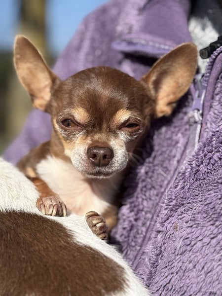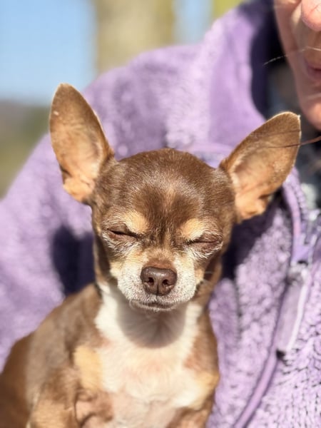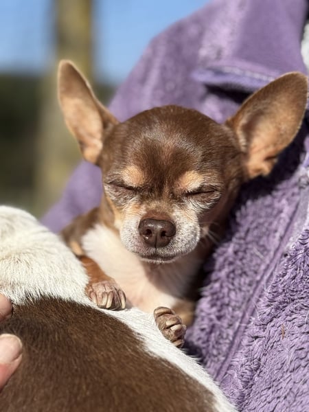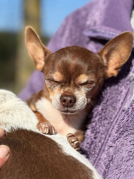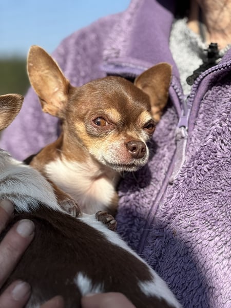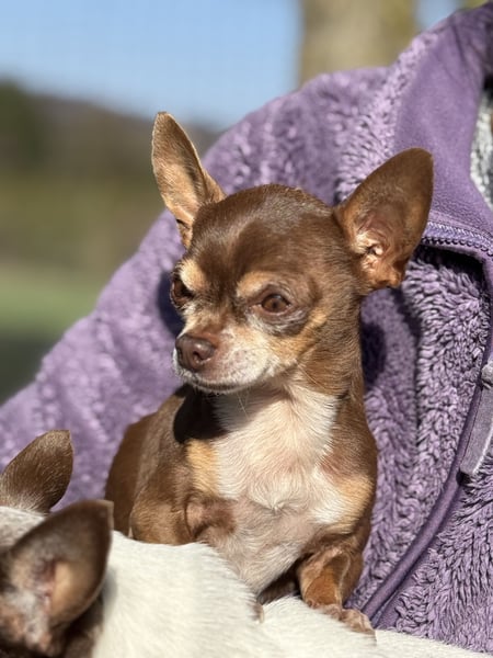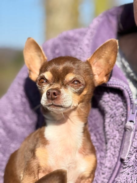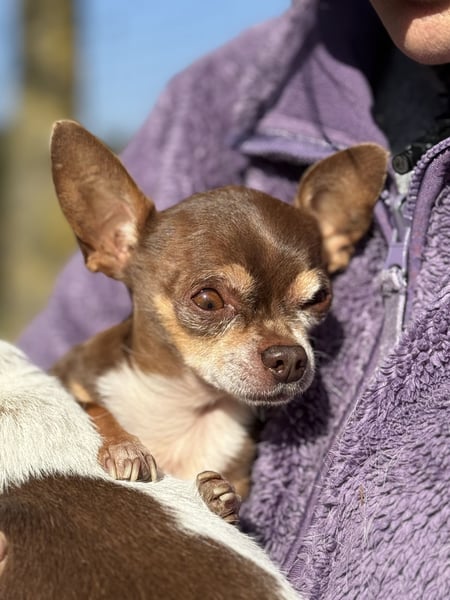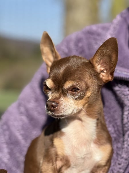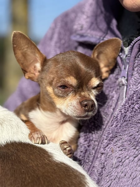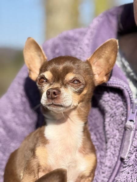 Kiwi ist, als Teacup-Chihuahua, um einiges kleiner und zierlicher und hat leider eine längere Krankengeschichte. Er leidet an Struvitsteinen und musste bereits wegen eines größeren Steins operiert werden. Auch aktuell ist das Thema weiterhin präsent und er wird regelmäßig untersucht. Beim Wasserlassen hat er gelegentlich Schwierigkeiten, weshalb er in Innenräumen eine Rüdenbinde trägt, was er gut kennt und problemlos akzeptiert. Trotz allem zeigt er sich lebensfroh und aufmerksam.