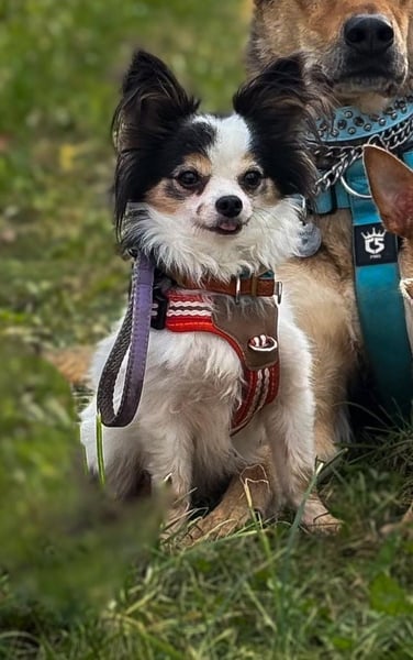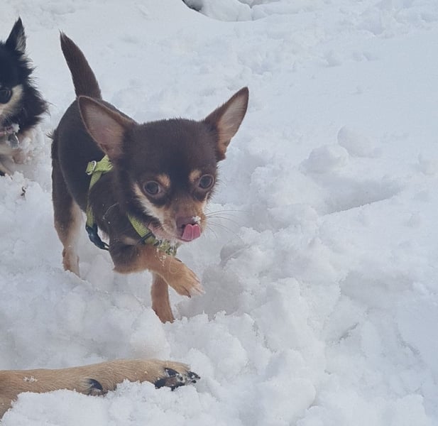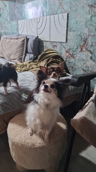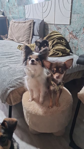 Clara ist eine einjährige chihuahua Hündin und die Tochter meiner Hündin nala. Gino ist ein chihuahua papillion Mix, kastriert. Clara ist eine sensible junge Dame, mir sehr viel Charme. Sie ist ein Clown, verschmust ,sehr gehorsam, liebt Futter und rennt gerne mit ihrem Menschen. Clara braucht etwas und rennt nicht sofort auf neue Menschen zu. Kinder sollten in ihrem neuen Zuhause nicht sein. Clara hatte ein Zuhause, aber leider waren die Besitzer mit einem dritten Hund letztlich überfordert, da ihre Hündin mit der situation absolut nicht warm geworden war. Clara verträgt sich perse mit jedem Hund, auch da braucht sie einfach Zeit. Da Clara nicht als Einzelhund gehalten werden kann und ein neuer Umzug natürlich auch wieder eine große Umstellung sein wird, darf Clara ausschließlich nur mit gino zusammen ausziehen. Gino ist ein fast 5 jähriger lieber kastrierter Rüde, der alltagsfest und in den meisten Situationen souverän ist. Gino ist Zuhause total ruhig, Clara bellt nur mal wenig zwischen durch ,aber keiner kläfft Zuhause. Gino ist ein kleiner Streber im Fuß laufen, ist wirklich gut erzogen, ein richtig süßer clown ,geht auf alle Menschen total offen zu und ist super verschmust. Beide rennen und spielen gern und sind schmusige süße Hunde. Clara ist total klasse im Freilauf sowie gino auch, bei Hunden sollte man aber gino rechtzeitig anleinen, denn sonst geht er auf kennlerntour, was nicht immer so mit jedem Hund gut wäre. Im Wald läuft er immer frei ,da er selbst in trieb abrufbar ist. Außerdem bleiben sie immer auf dem Weg und entfernen sich auch nicht so weit. Sie sind sehr sozial und unkompliziert. Man sollte sie nehmen wie sie sind ,denn sie sind auf ihre eigene Art perfekt. Clara wird nicht als Gebärmaschine vermittelt, denn es gab dazu leider viele Anfragen . Eine Vermittlung zu einem intakten rüden kommt nicht in Frage. Clara und Gino bilden ein gutes Team und sind einfach nur tolle Hunde. Eine einzelvermittlung kommt auch nicht in Frage. Sie bekommen ein großes Paket mit, wo sie alles haben, über Geschirre,leinen, Schuhe, Socken, pullover,Bademäntel,Sommer und winterjacken, einem Körbchen, einem Hunderucksack ,2 decken, Spielzeug, Näpfe und natürlich ihre Impfpässe. Sie kennen barf , werden aber mittlerweile mit einem halbfeuchten Hundefutter gefüttert und vertragen es gut. Sie haben weiße Zähne, immer geschnittene krallen und keinen zahnstein. Zähne putzen ist zu empfehlen. Hier empfiehlt sich auch ein super Zahnspray was ich schon seit Jahren gerne verwende. Wir freuen uns auf Ihre ernstgemeinten Anfragen.