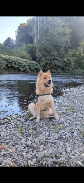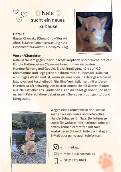 Nala ist Neuem gegenüber zunächst skeptisch und braucht ihre Zeit. Für die Haltung eines Chowskys braucht man am besten Hundeerfahrung und Geduld. Sie ist intelligent, hört auf >20 Kommandos und liegt gerne auf ihrem roten Hundesack. Nala hat ein ruhiges Wesen und ist, wenn sie jemanden ins Herz geschlossen hat, loyal und kuschelbedürftig. Eine Verträglichkeit mit anderen Hunden ist oft schwierig. Am besten kommt sie mit älteren Rüden aus. Nala ist eher ans Landleben als an die Stadt gewöhnt und liebt es, beim Fahrradfahren dabei zu sein. Sie ist gechippt, geimpft und Kerngesund.
