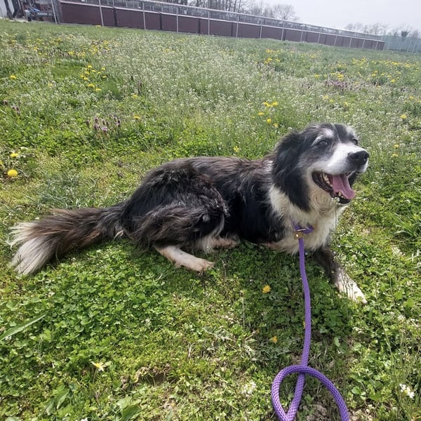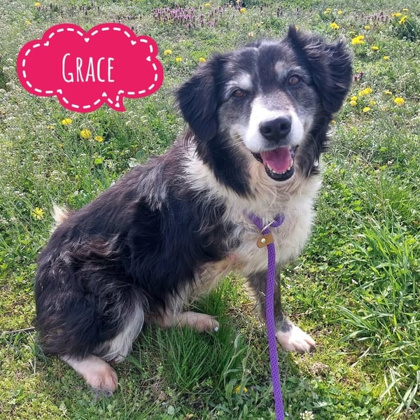 Grace ist ein Mädchen, sie ist laut Tierarztschätzung ca. 6,5 Jahre alt (geb. 31.10.2019), wiegt 19,5 kg und ist 53 cm groß. Vermutet wird ein Collie Mischling. Sie ist ein Dreibeinchen.