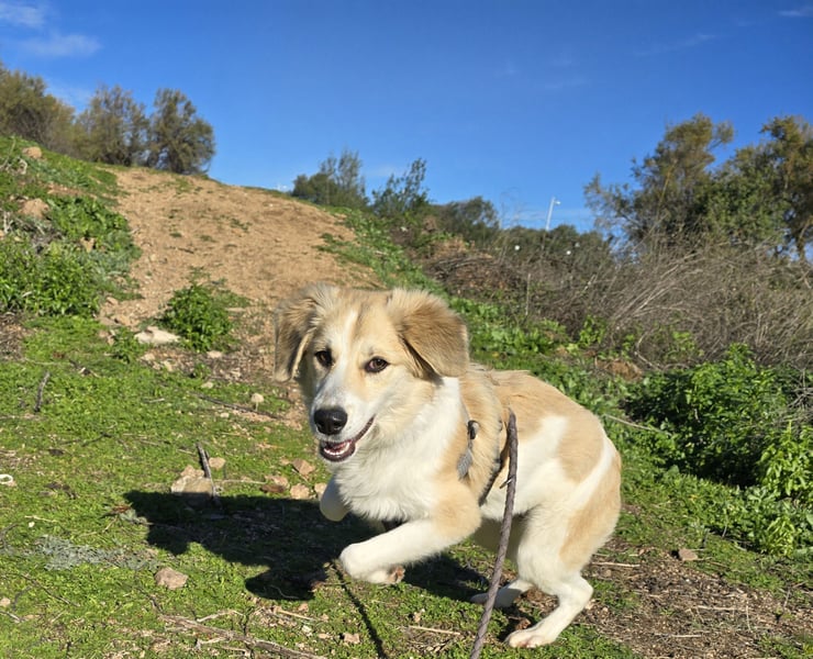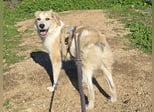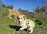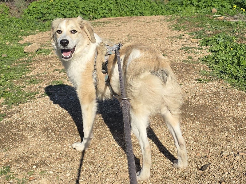 Buffy ist wahrscheinlich ein Collie Mischling. Sie sieht auf den Fotos größer aus als gedacht. Wir schätzen ihre Endgröße auf ca. 50 cm