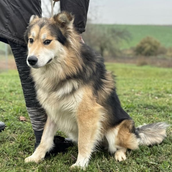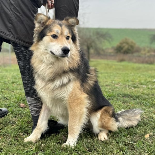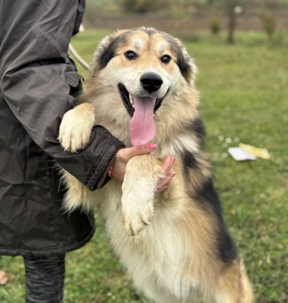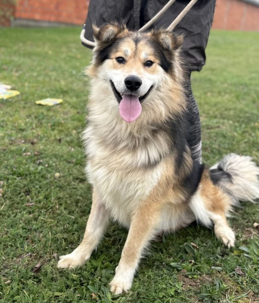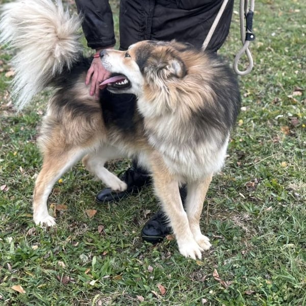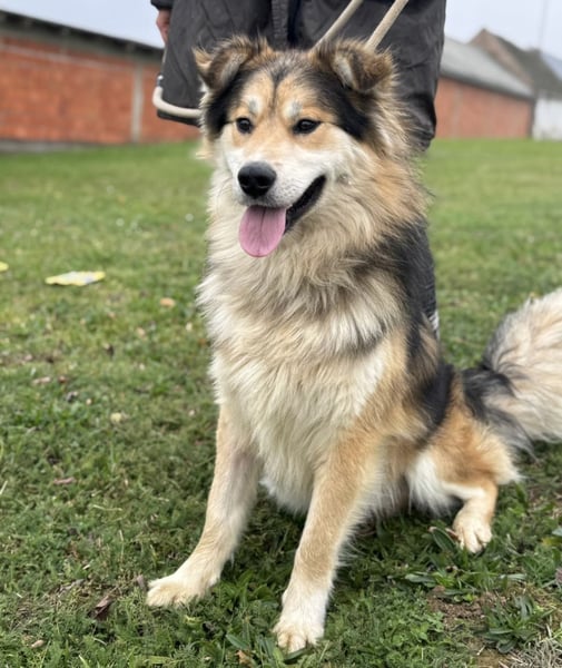 Boki ist ein Rüde, laut Tierarztschätzung ca. 1 Jahr alt (geb. 01.10.2024), etwa 25 kg schwer und 63 cm groß. Vermutet wird ein Collie-Samojede-Schäferhund Mischling.
