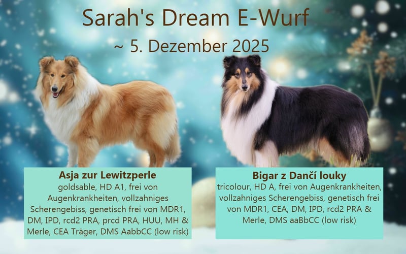 Die Welpen werden somit alle genetisch frei von MDR1, DM, IPD, rcd2 PRA und Merle sein und genetisch und/oder klinisch frei von CEA.