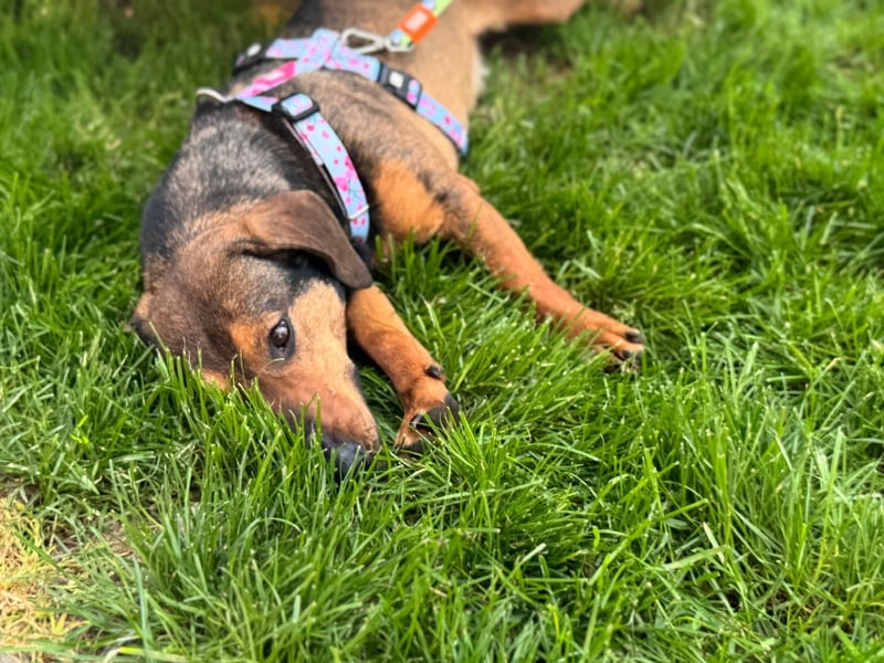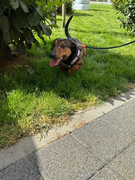 Wenn Lebensfreude ein Hund wäre – dann wäre es Lea! Diese dackelähnliche Frohnatur strahlt mit der Sonne um die Wette und steckt alle mit ihrer guten Laune an.