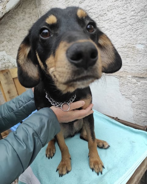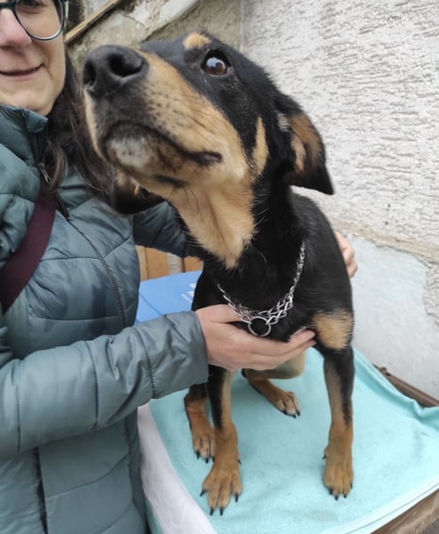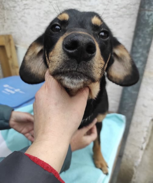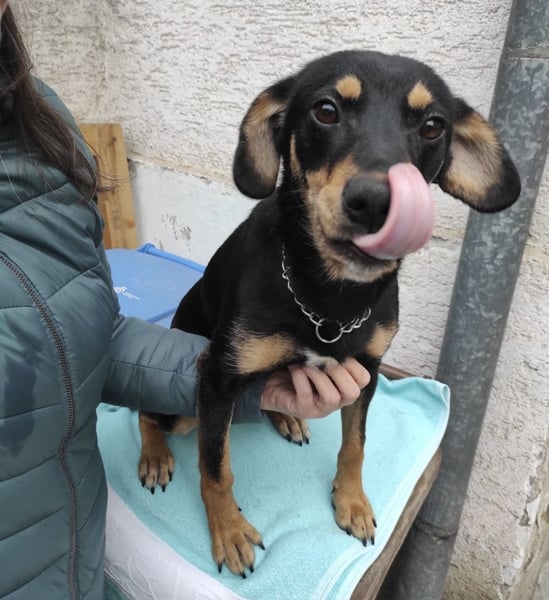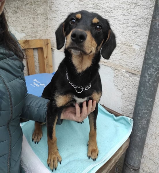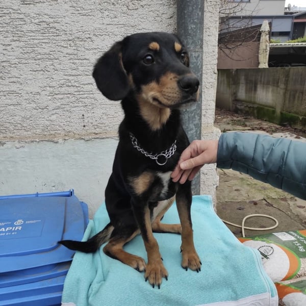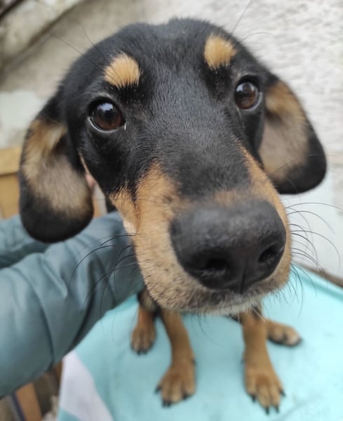 Liam ist ein junger Bub, laut Tierarztschätzung ca. 1 Jahr alt (geb. 28.01.2025), etwa 40 cm groß und wiegt ca. 12 kg. Vermutet wird ein Dackel-Mischling – nur mit etwas längeren Beinchen.