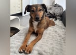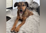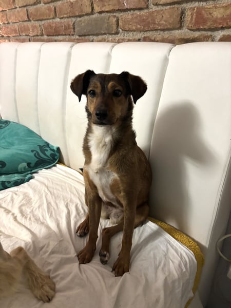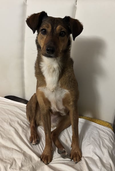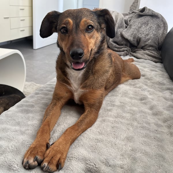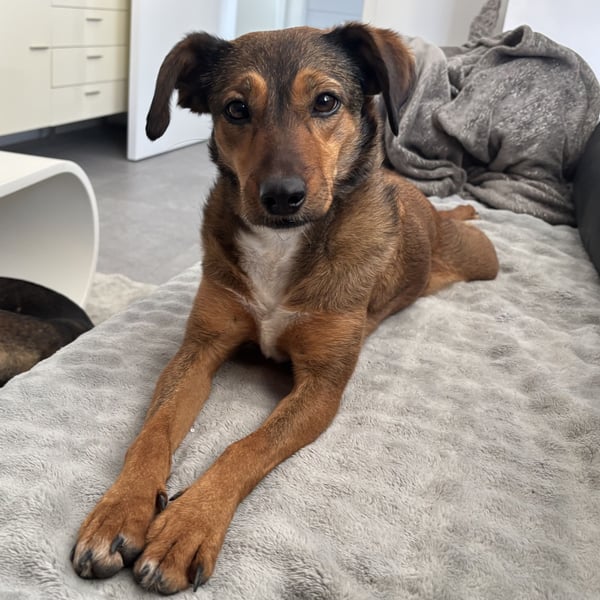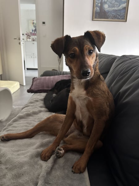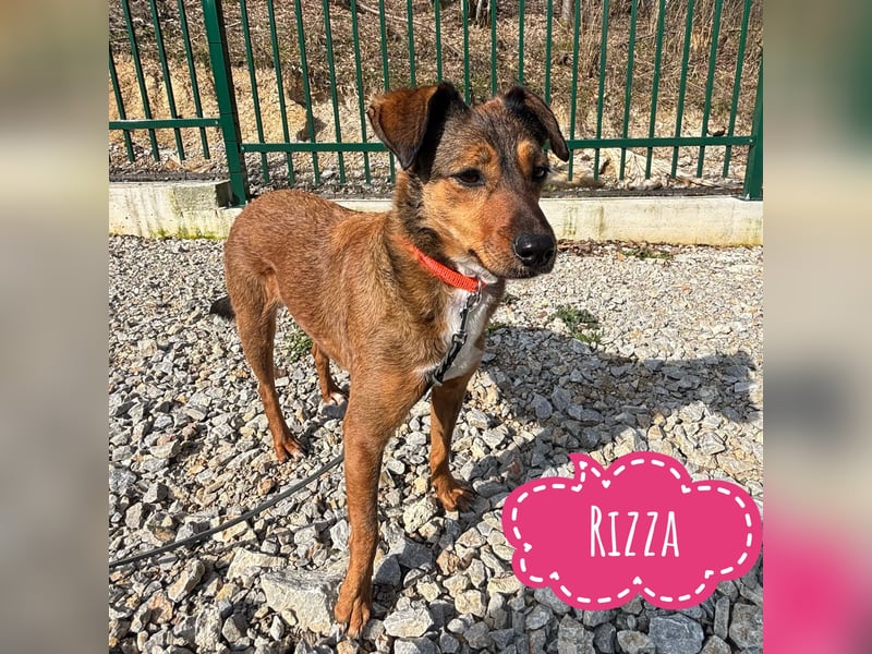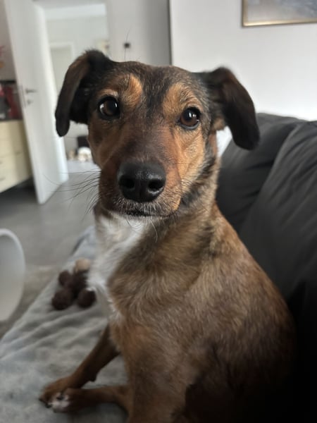 Rizza (Passname Sunčica), ist ca. 4 Jahre alt (16.02.2022), wiegt 12kg und ist ca. 35cm groß. Vermutet wird ein Dackel - Bracke Mischling.