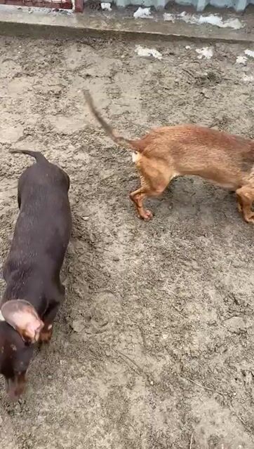 Derzeit lebt Little Foot problemlos mit anderen Hunden in einem gemischten Rudel zusammen und zeigt sich dabei sozial und verträglich.