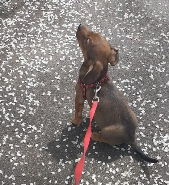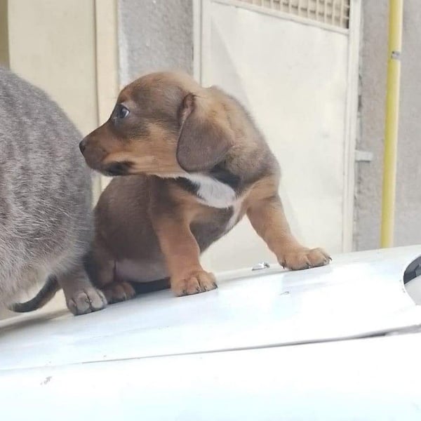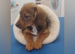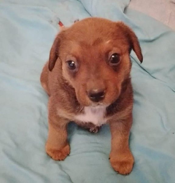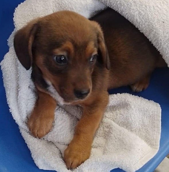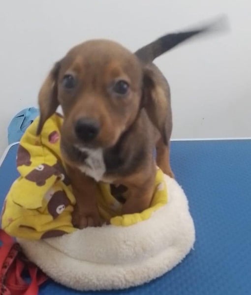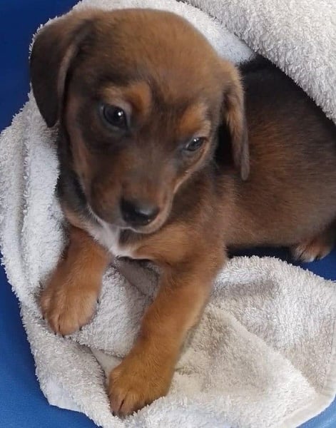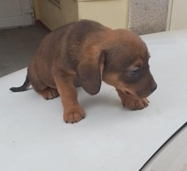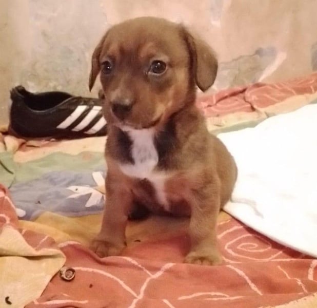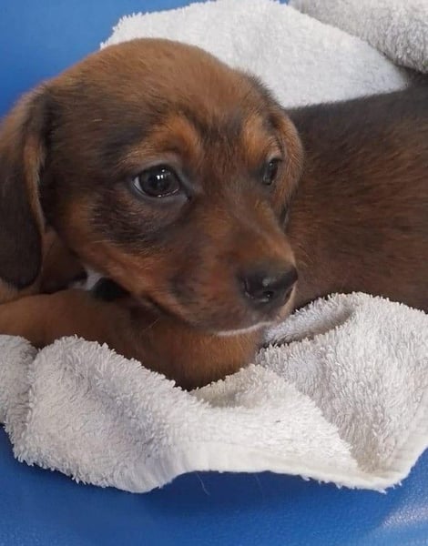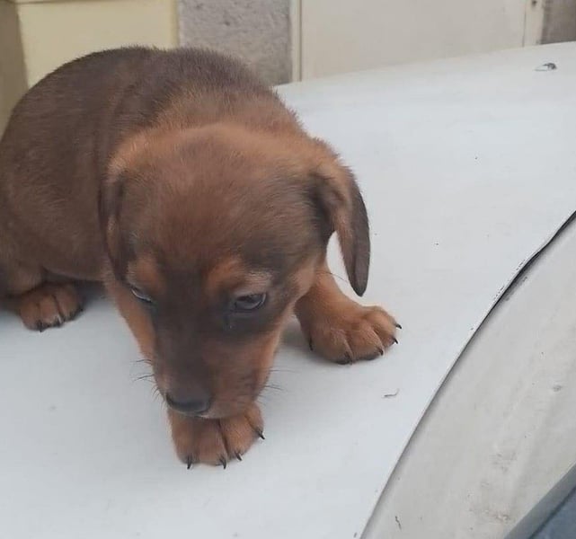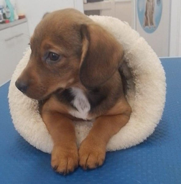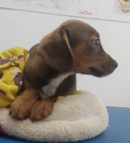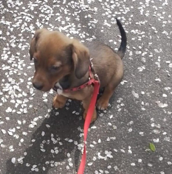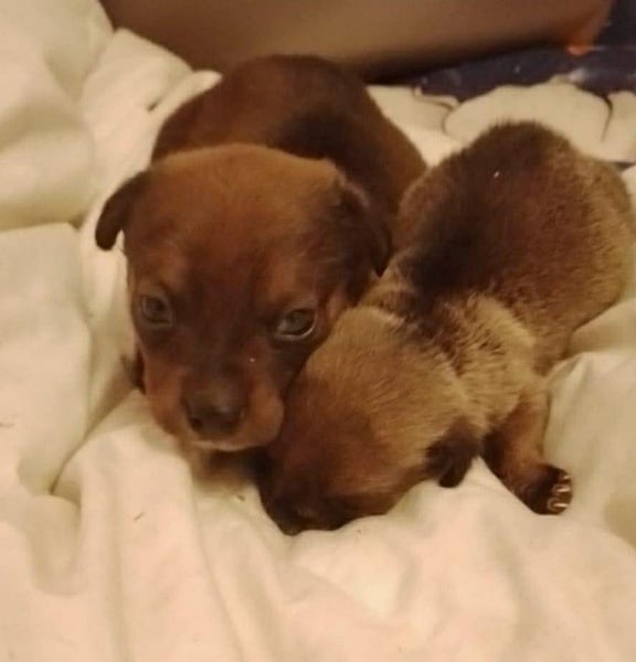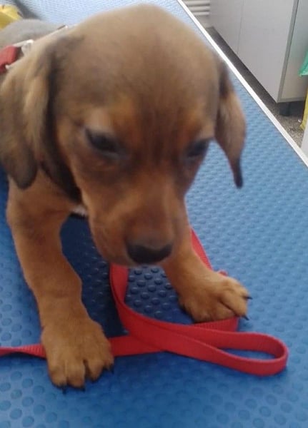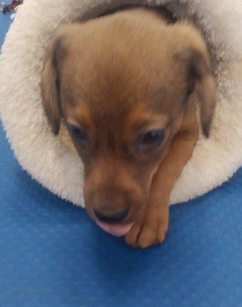 Die Nachbarn hatten versucht, die Mama und ihre Welpen einzufangen. Als die Dackelmama den Käfig sah, ist sie geflüchtet und nicht wieder zurückgekommen. Da es nachts sehr, sehr kalt war, hat Aurelia die Kleinen bei sich aufgenommen, gefüttert und versorgt. Hope wog bereits ein kg, die Schwester nur 300 g. Mit drei Wochen starb die Schwester, sie war leider zu schwach.