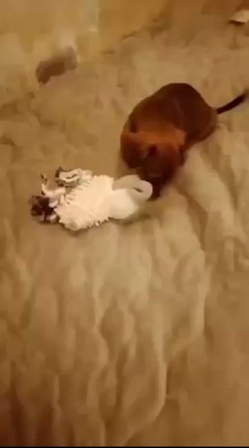 Auch mit Katzen hat sie keinerlei Probleme und ist ihnen gegenüber sehr freundlich. Da ihre Spielkameraden jetzt adoptiert wurden, möchte sie immer mit der Katze spielen, sie findet das aber nicht immer so toll.