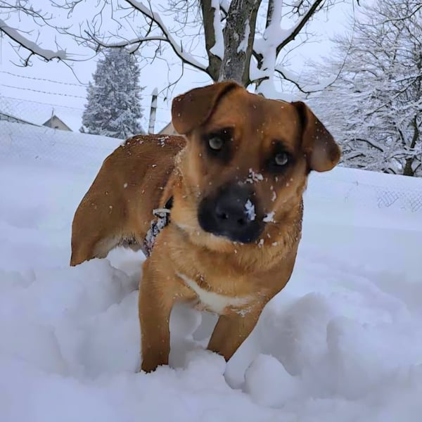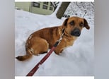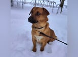 Dunna ist ein Mädchen, sie ist laut Tierarztschätzung ca. 11 Monate alt (geb. 08.02.2025), wiegt 13 kg und ist 42 cm groß. Vermutet wird ein Dackel Mischling.