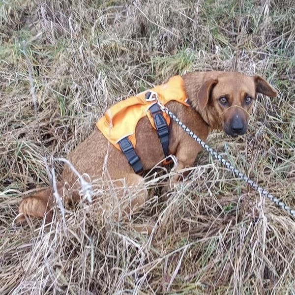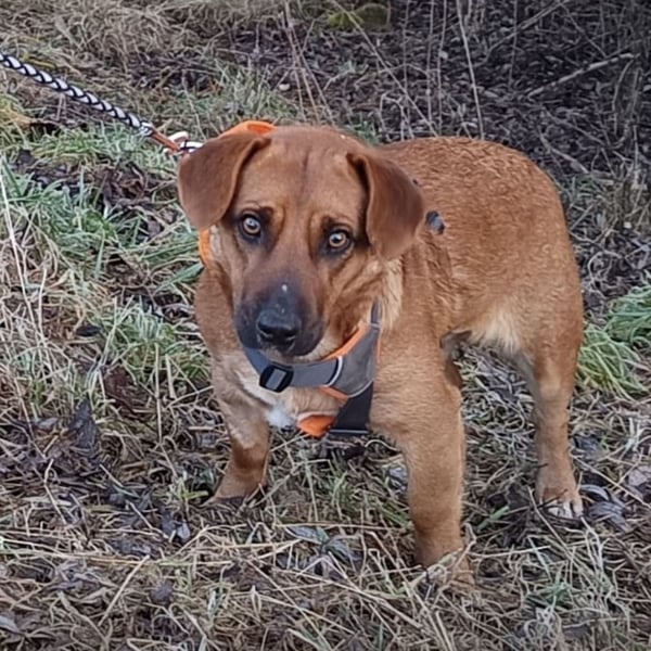 Dunna ist ein Mädchen, sie ist laut Tierarztschätzung ca. 1 Jahr alt (geb. 08.02.2025), wiegt 13 kg und ist 42 cm groß. Vermutet wird ein Dackel Mischling.