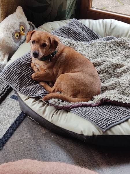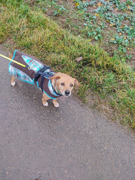 Seit dem 29.11.25 lernt der kleine freundliche Kerl auf der Pflegestelle in Rheinland-Pfalz (Nähe Otterberg) endlich ein hundegerechtes Leben kennen.