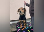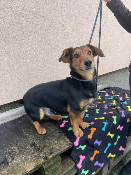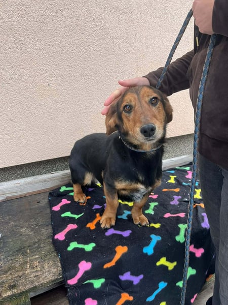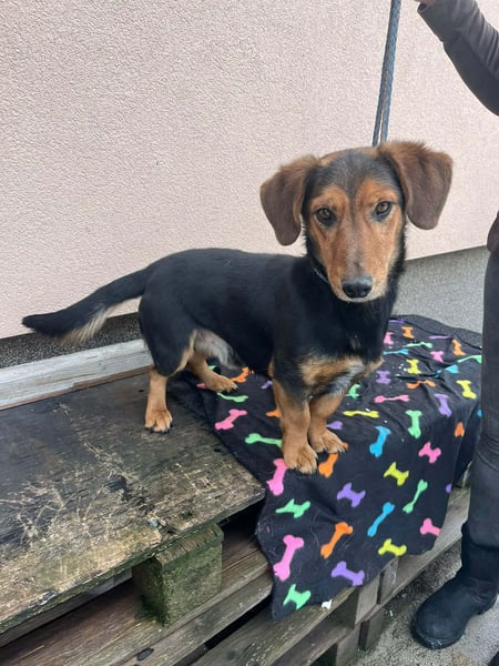 Mucki ist ein 34 cm großer Dackelmischlingsrüde, geboren Mitte 2023.