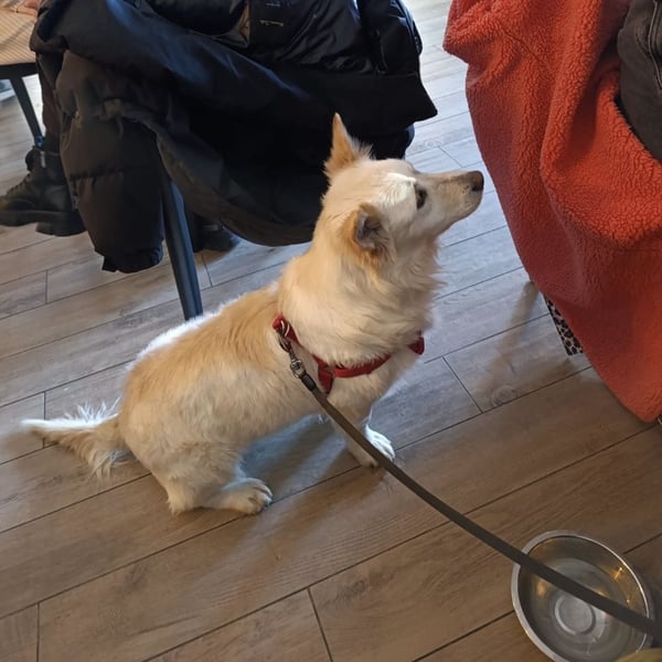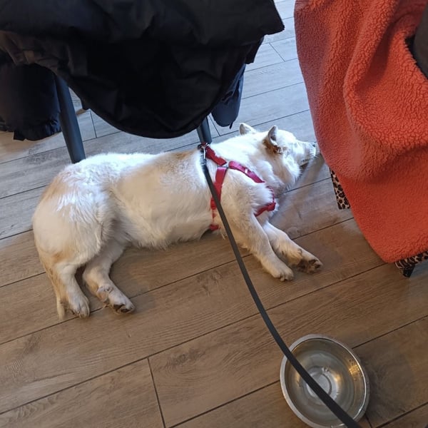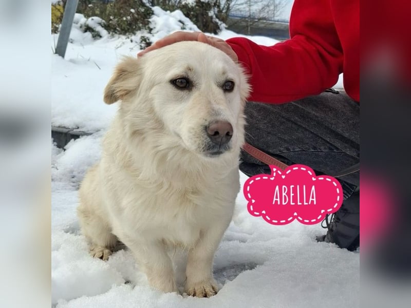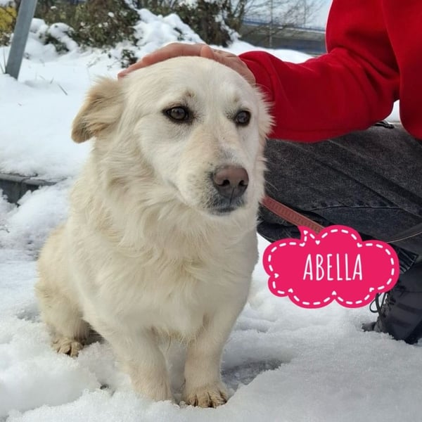 Abella ist ein Mädchen, sie ist laut Tierarztschätzung ca. 2 Jahre alt (geb. 08.01.2024), misst 36 cm und wiegt aktuell etwa 16 kg (etera pummelig). Durch ihre kurzen Beine ist sie eine ganz besondere Erscheinung; vermutet wird eine Mischung aus Dackel/Labrador/Terrier.