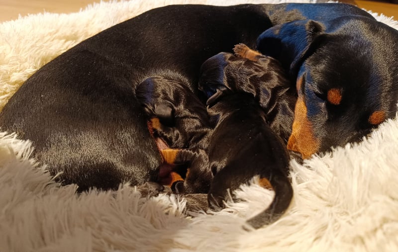 Geboren werden sie in den nächsten Tagen von unserer Liselotte. Unsere Zucht ist vom Deutschen Teckelklub (VDH/FCI) abgenommen. Liselotte hat alle nötigen Gesundheitsuntersuchungen inkl. das Rückenscreening, Prüfungen und Begutachtungen durchlaufen.