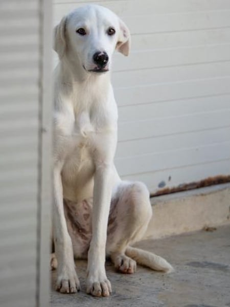Monia ist eine außergewöhnlich schöne Hündin – ihr weißes Fell, gesprenkelt wie bei einem Dalmatiner, lässt sie wirken wie ein kleines Kunstwerk der Natur. Doch noch viel schöner als ihr Äußeres ist ihr Wesen: sanft, sensibel und voller leiser Hoffnung.