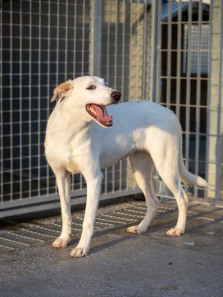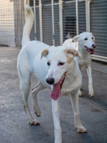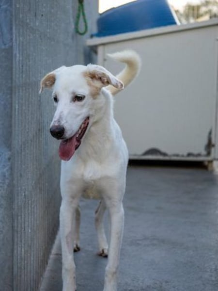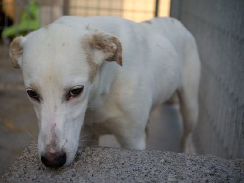 Heute ist Marilia eine junge Hündin von stiller Schönheit: schneeweißes Fell, durchzogen von zarten, hellbraunen Flecken – als hätte jemand vorsichtig Aquarellfarben über sie getupft. Doch was sie wirklich besonders macht, liegt nicht im Äußeren, sondern in ihrer sanften, vorsichtigen Art.