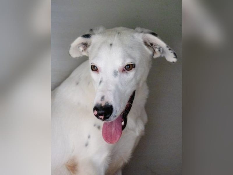 Und wenn man ihn ansieht, erkennt man sofort, dass Markus etwas ganz Besonderes ist: Seine Zeichnung erinnert an einen Dalmatiner – weißes Fell, durchsetzt mit dunklen Tupfen, die ihn zu einem echten Hingucker machen. Seine Öhrchen stehen lustig in die Welt, wenn er lauscht. Ein wunderschöner, einzigartiger Hund, der trotz seiner Unsicherheit eine leise Eleganz ausstrahlt.