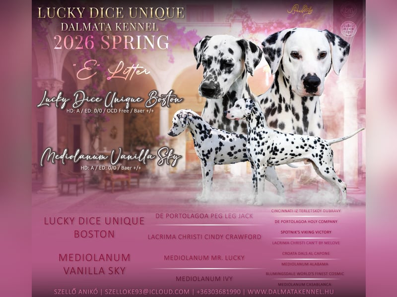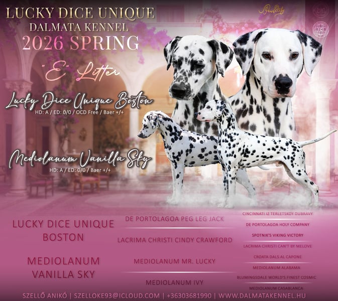 Die Lucky Dice Unique Dalmatiner Zucht nimmt ab sofort Vormerkungen für den im Frühjahr 2026 erwarteten E -Wurf entgegen.