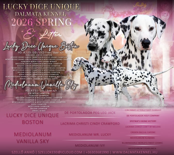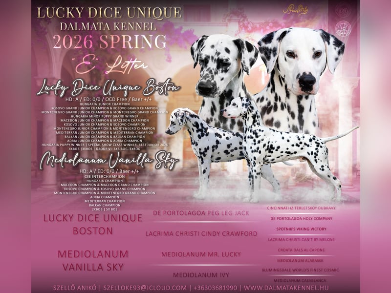 Der Lucky Dice Unique Dalmatiner Kennel nimmt ab sofort Vormerkungen für den für Sommer 2026 erwarteten E-Wurf entgegen.