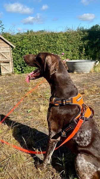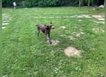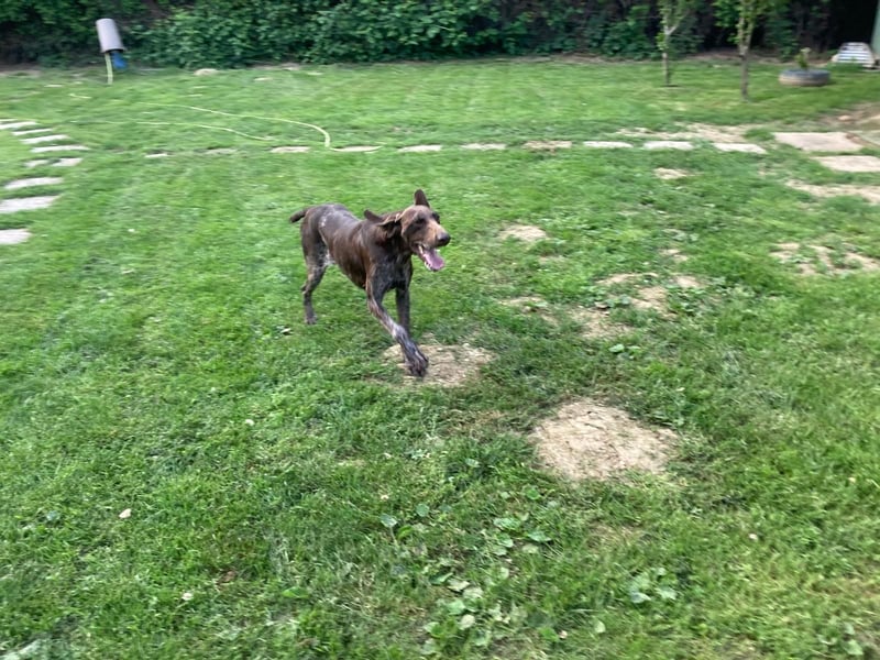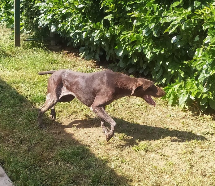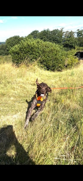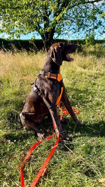 Draußen sieht es - jagdhundtypisch - ganz anders aus: dort hat Donna einen hohen Bewegungsdrang und wenn sie Witterung aufnimmt, ist sie derzeit noch nicht abrufbar.