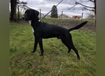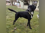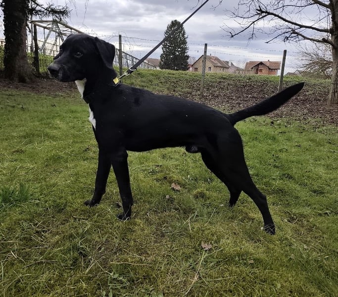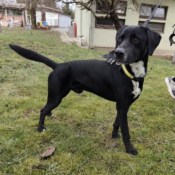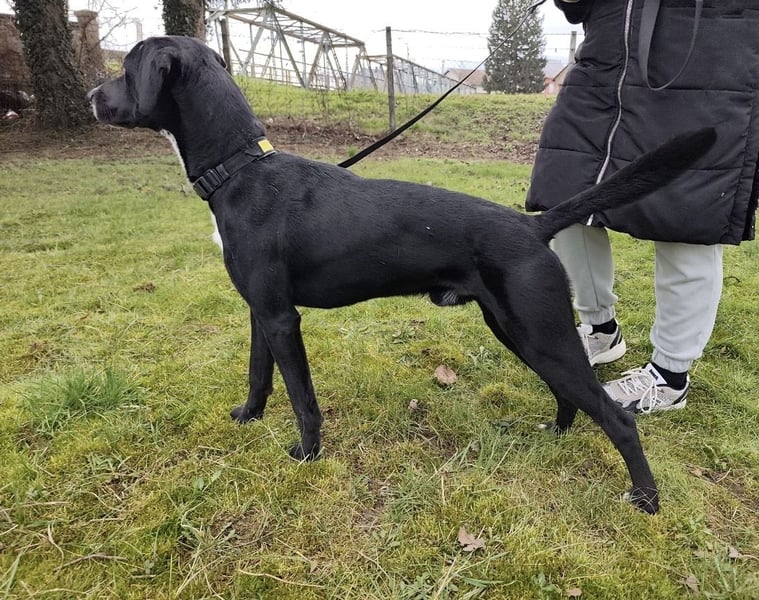 Kalle ist ein junger, beeindruckender Rüde mit kurzer schwarzer Fellfarbe, einer weißen Blesse über der Brust und weiteren weißen Abzeichen am Körper. Er wirkt elegant und sportlich – und genauso ist er auch vom Wesen her. Ein freundlicher, sozialer und aufgeschlossener Hund, der sehr gerne Kontakt zu Menschen sucht.