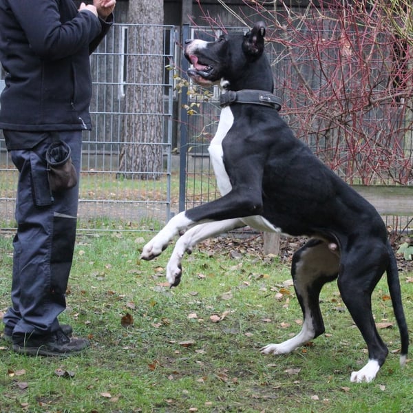 Manetti wurde wegen Überforderung bei uns abgegeben. Bis dahin lebte der junge Rüde im 11. Stock eines Plattenhauses. Da sein Halter ihn nicht mehr führen konnte, kam er in dieser Zeit kaum noch raus.