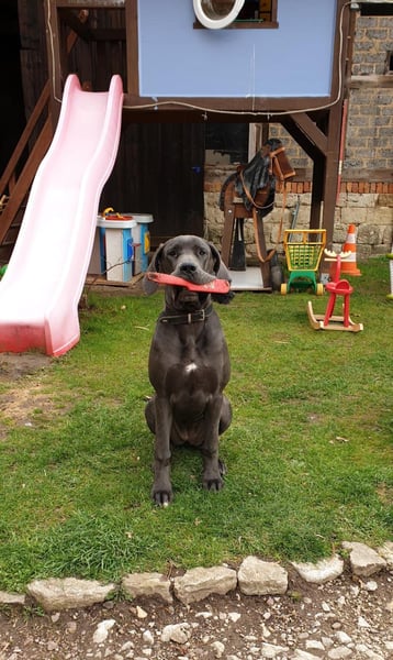 Wir sind eine Familie in der Nähe von Erfurt, leben auf einem Bauernhof und haben die Abby, unsere Deutsche Dogge, seit 3 Jahren. Abby ist eine sehr anhängliche, aufmerksamkeitsliebende Dogge. Sie benötigt eine klare Hand, da sie sehr dominant sein kann.