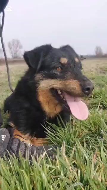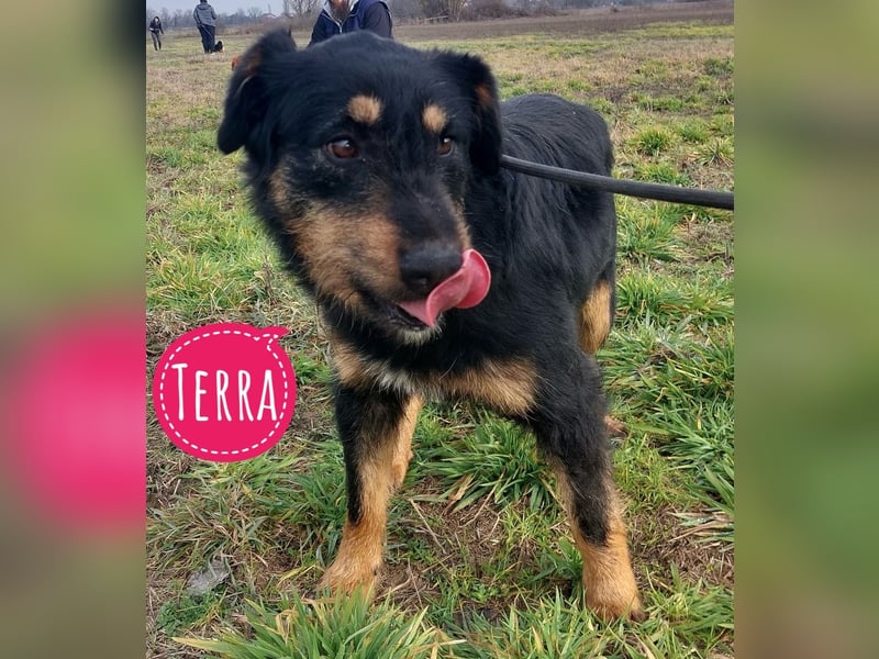Terra ist ein Mädchen, laut Tierarztschätzung ca. 5,5 Jahre alt (geb. 20.10.2020), ist 56 cm groß und wiegt 18 kg. Vermutet wird ein Deutscher Jagdterrier Mischling.