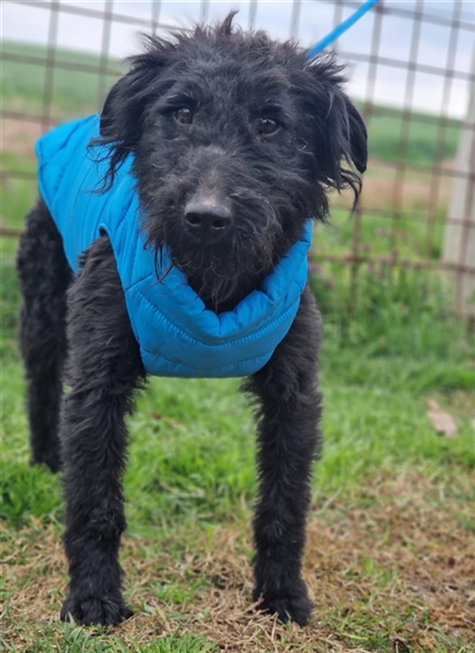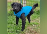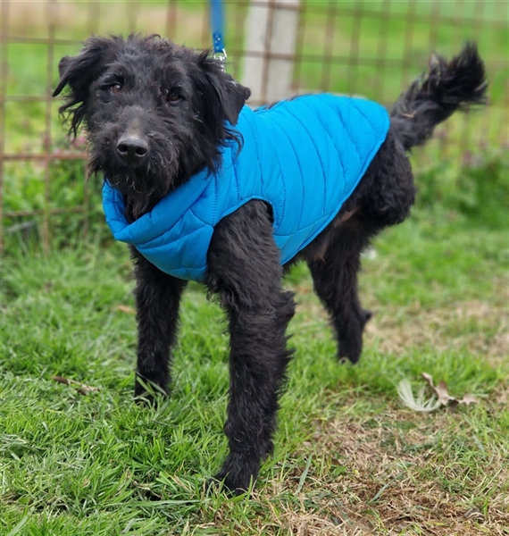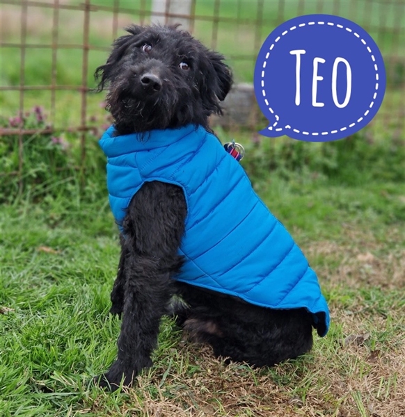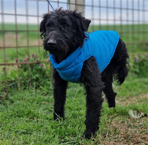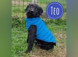 Teo hat für extra ein Mäntelchen angezogen, er hofft dass es etwas ablenkt da er schon als Terrier schlechte Karten hat, noch schlechtere weil er ein Dreibeinchen ist und noooch schlechtere da er schwarz ist