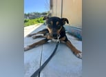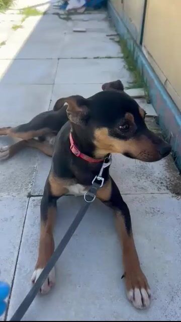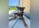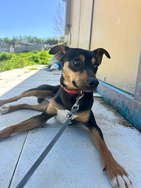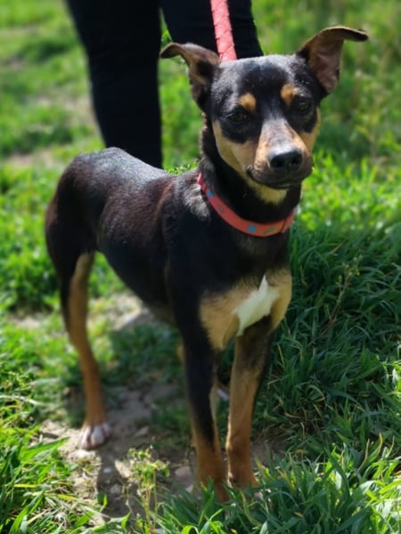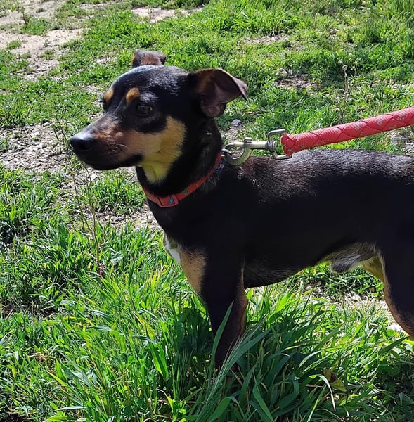 Donut ist ein junger, hübscher Pinscher-Mischlingsrüde.