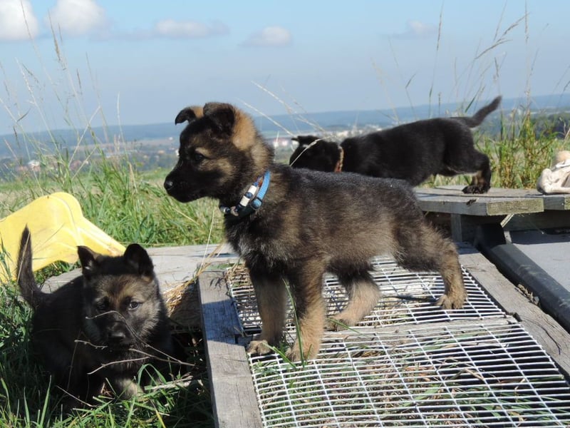 Dunkelgrauer Rüde mit dominantem Auftreten seinen Geschwistern gegenüber, aufgeschlossen und freundlich zum Menschen