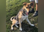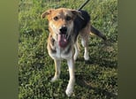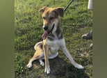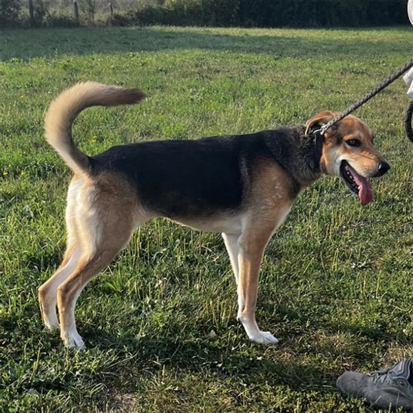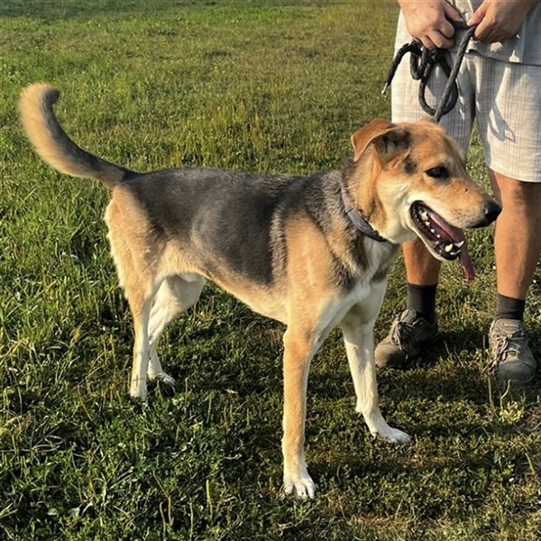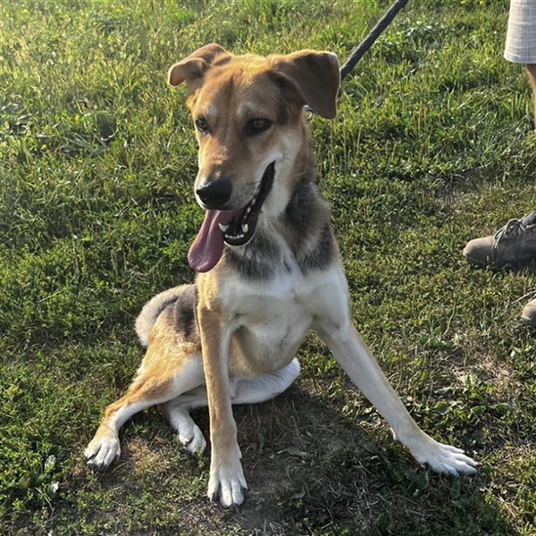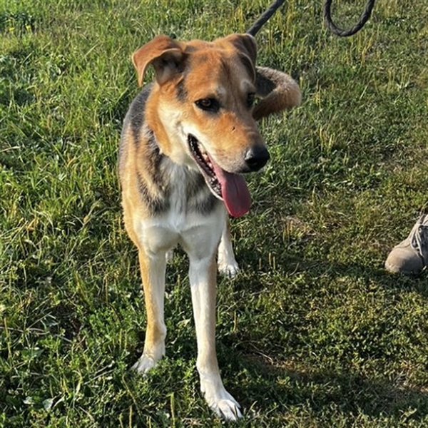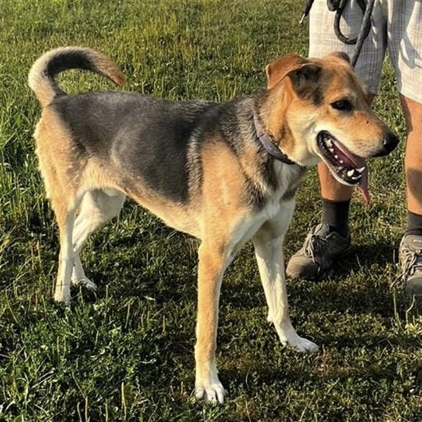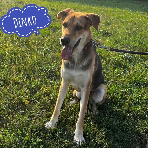 Dinko ist ein Bub, er ist ca. 3 Jahre alt (geb. 20.06.2021), wiegt ca. 29kg und ist 65cm groß. Vermutet wird eine Polnische Bracke - Schäferhund Mix.