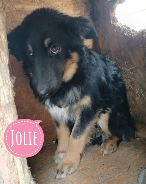 Über Jolies Vergangenheit weiß man leider nichts, da sie als Welpe ausgesetzt wurde und in einem Dorf auf der Straße alleine gefunden wurde. Seit Oktober 2025 lebt sie in einem kroatischen Tierheim (Karlovac).
