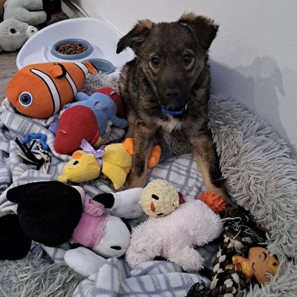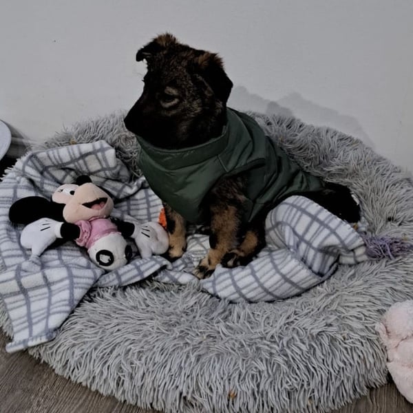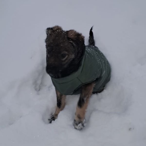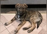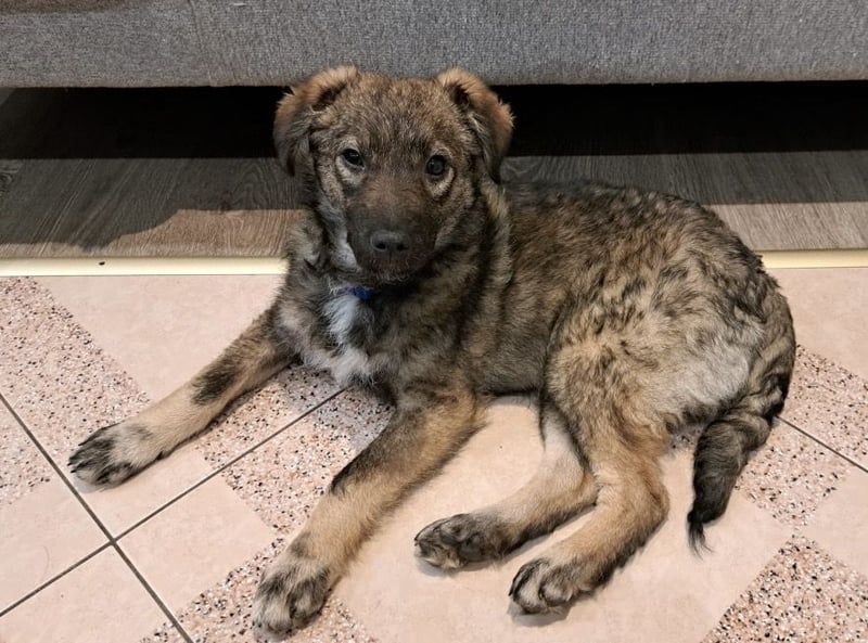 Uno ist ein Bub, laut Tierarztschätzung ca. 5 Monate alt (geb. 25.08.2025), wiegt aktuell 7,2 kg und ist etwa 38 cm groß. Vermutet wird ein Schäferhund Mischling, obwohl er von der Färbung auch Sarplaninac Gene haben könnte. Trotzdem wird er voraussichtlich nicht zu großen, sondern kniehohen, mittelgroßen Hunden gehören.