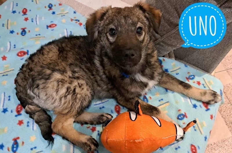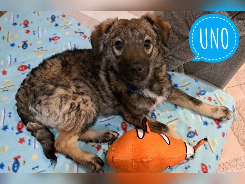 Uno wurde als Welpe mit ganzem Wurf ausgesetzt gefunden und verbrachte zwei Monate im kroatischen Tierheim (Karlovac). Alle seine Geschwister wurden vermittelt – nur er blieb allein und traurig im Zwinger zurück. Eine Volontärin wurde darauf aufmerksam und sorgte dafür, dass Uno auf eine Pflegestelle vor Ort ziehen durfte.