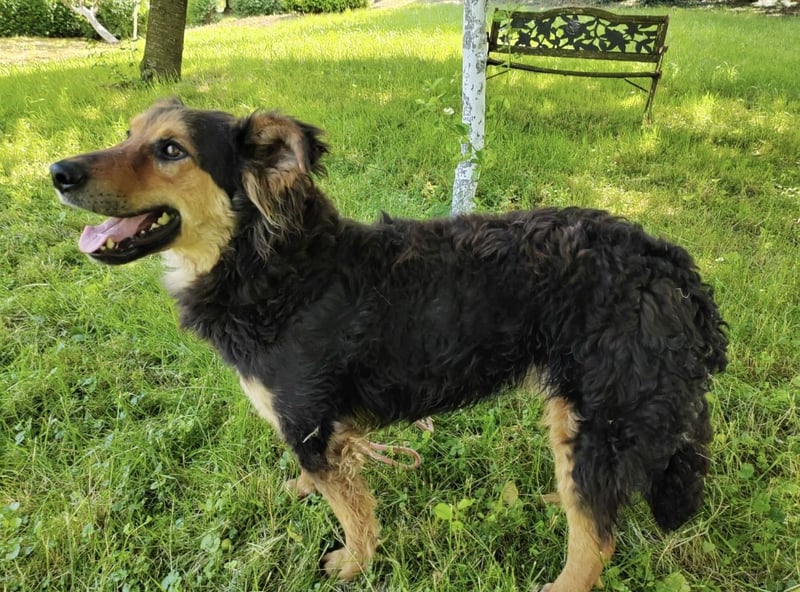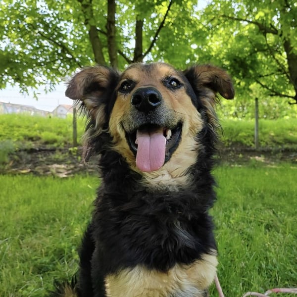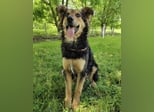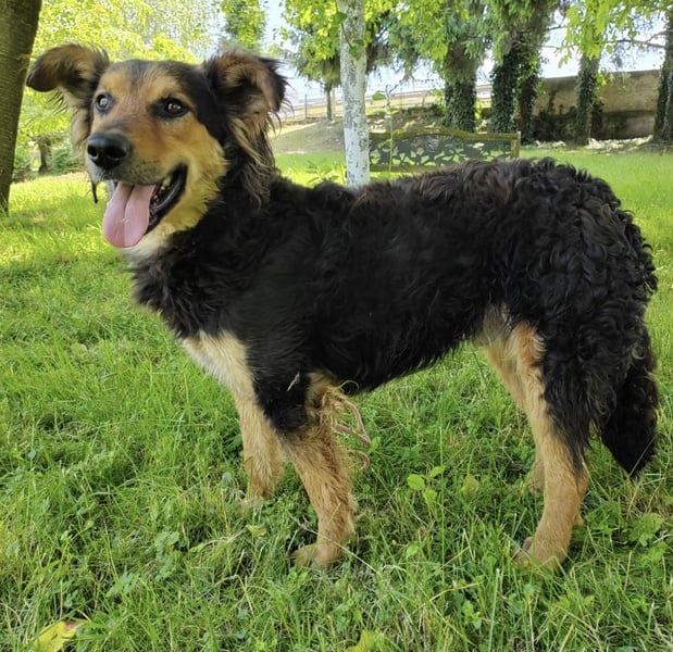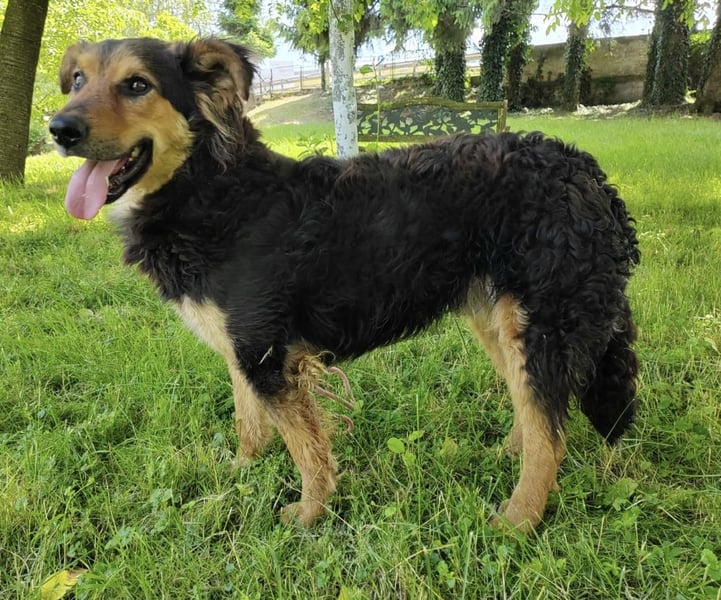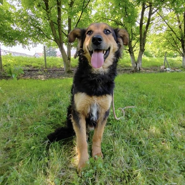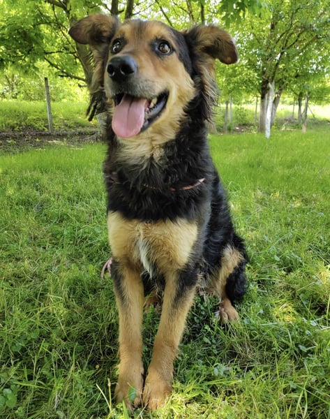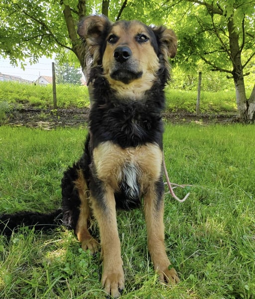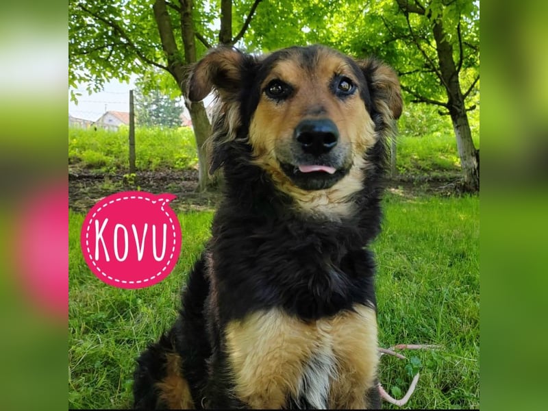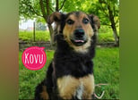 Kovu ist ein Bub, er ist laut Tierarztschätzung ca. 2,5-3 Jahre alt, wiegt 21,6kg und ist 54cm groß. Vermutet wird ein kleinerer English Shepherd- Schäferhund.