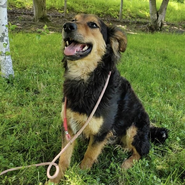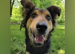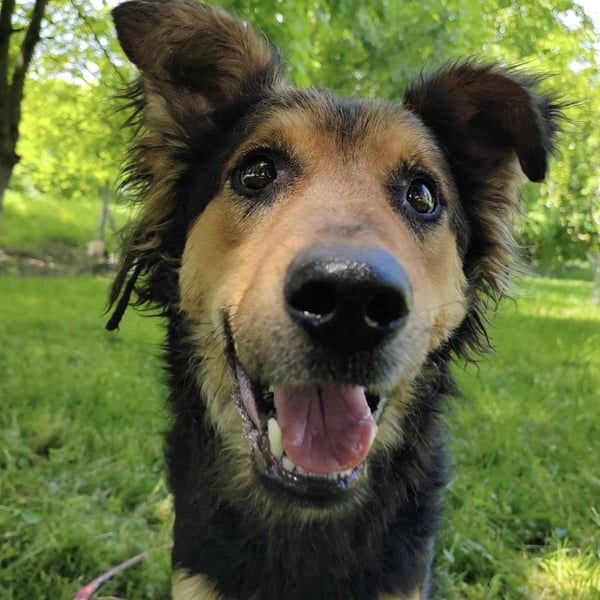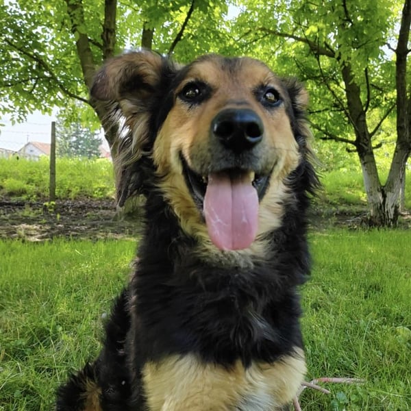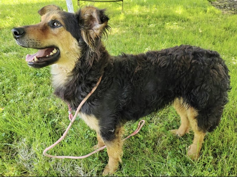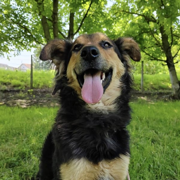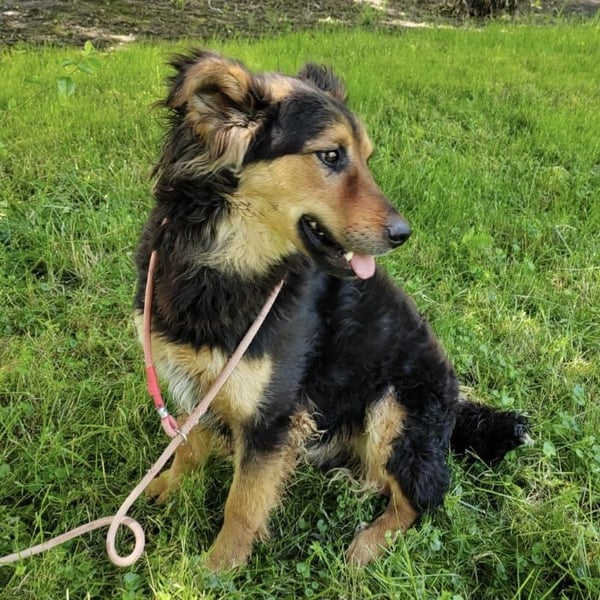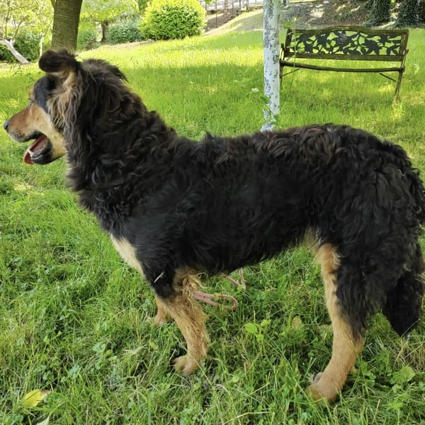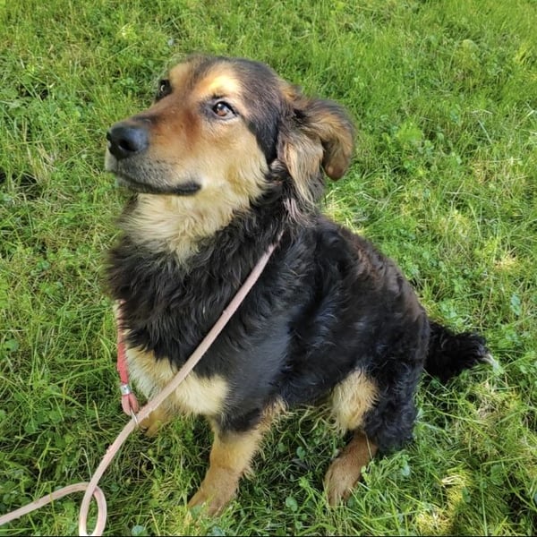 Kovu ist ein Bub, er ist laut Tierarztschätzung ca. 2,5-3 Jahre alt, wiegt 21,6kg und ist 54cm groß. Vermutet wird ein kleinerer English Shepherd- Schäferhund.