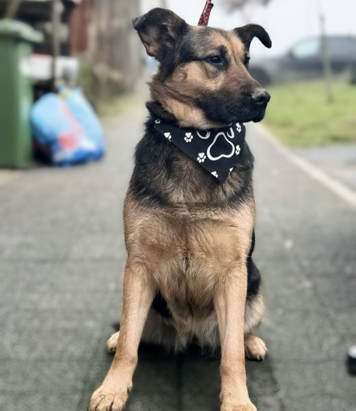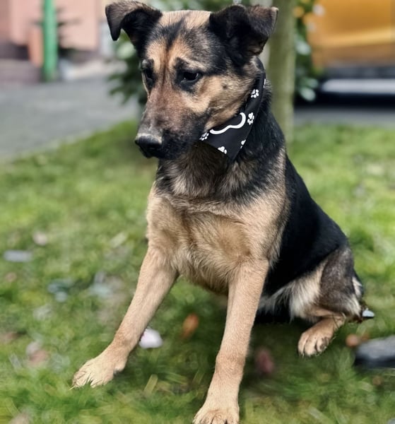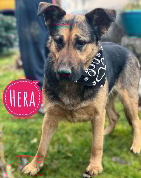 Hera ist ein Mädchen, sie ist ca. 1 Jahr alt (geb. 19.03.2024), sie wiegt 32kg und ist 56cm groß, ein Deutscher Schäferhund - Mix.