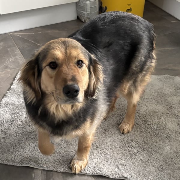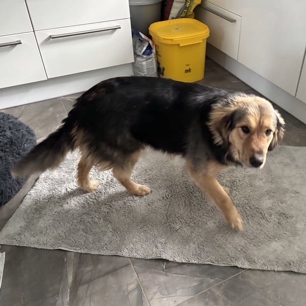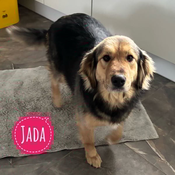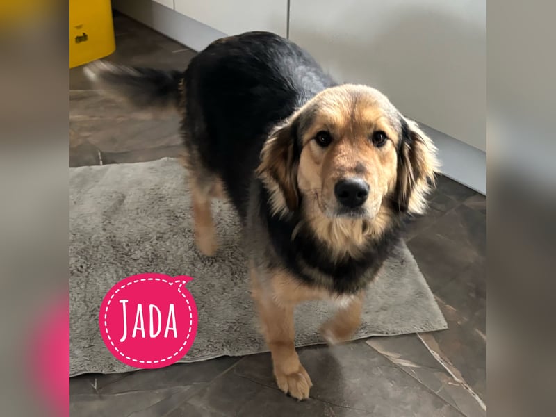 Jada ist ein Mädchen, sie ist laut Tierarztschätzung fast 3 Jahre alt (geb. 17.03.2023). Sie ist 55cm groß und wiegt 28kg (wegen langer Zwingerhaltung bisschen zu dick). Vermutet wird ein Deutscher Schäferhund Mischling. Obwohl sie das Gesicht wie ein Plüsch Teddybär hat, vielleicht ein Collie Anteil.
