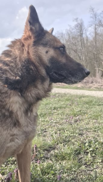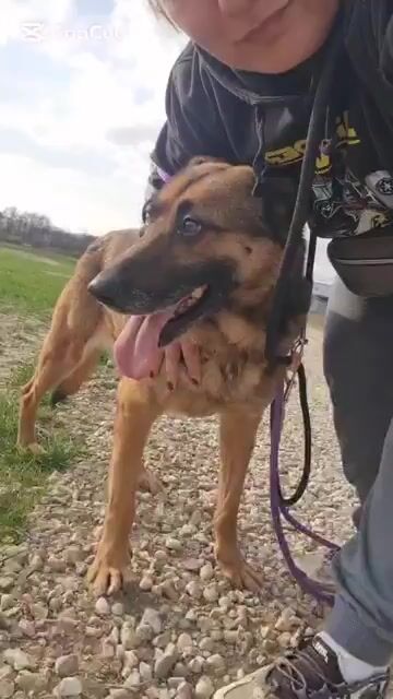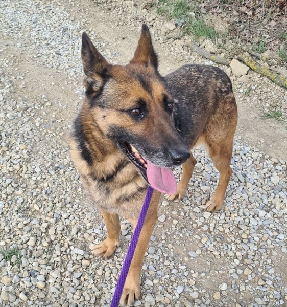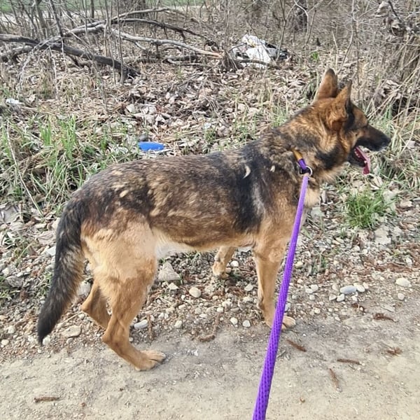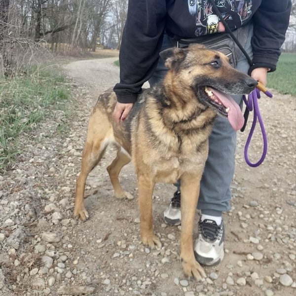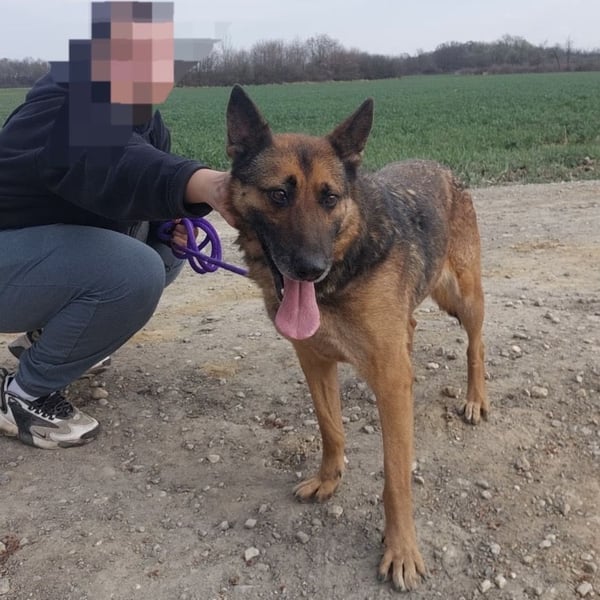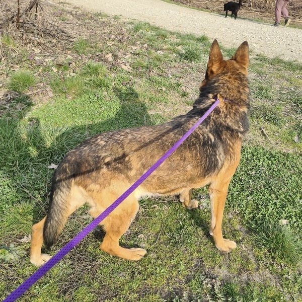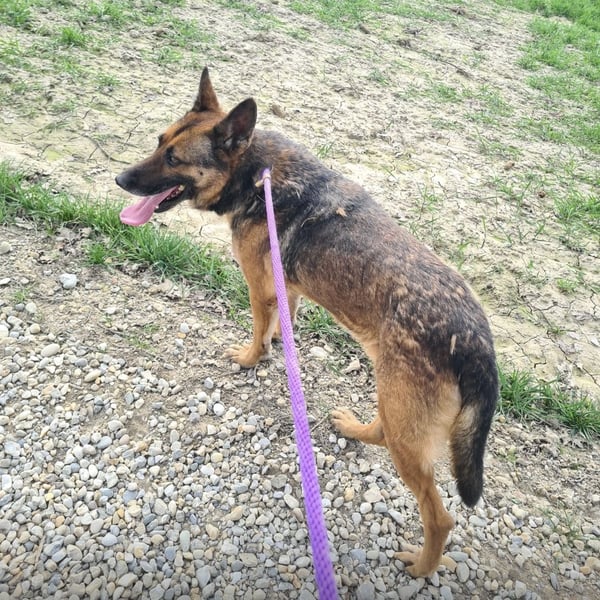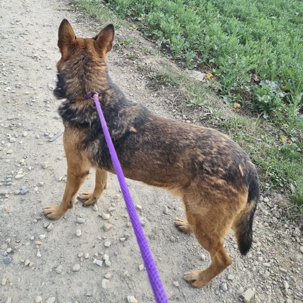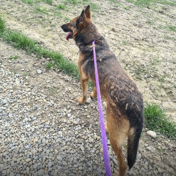 Außerhalb des Zwingers wirkt er dagegen vorsichtiger und verwirrt. Seine Ohren legen sich an, er wird unsicher und bleibt aufmerksam. Er kommt zwar auf Zuruf, nimmt Leckerlis und lässt sich führen – aber die unbeschwerte Freude scheint wie verschwunden. Es wirkt, als hätte er Angst, wieder irgendwohin gebracht zu werden.